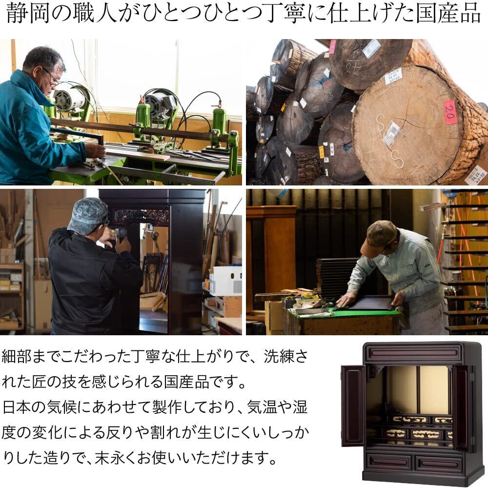 こちらのお仏壇は、熟練の職人によって国内で製造された国産品です。細部までこだわった丁寧な仕上がりで、洗練された匠の技を感じていただけます。日本の気候にあわせて製作しており、気温や湿度の変化による反りや割れが生じにくいしっかりした造りで、末永くお使いいただけます。“Made in Japan”ならではの安心と信頼の国産仏壇をお届けいたします。