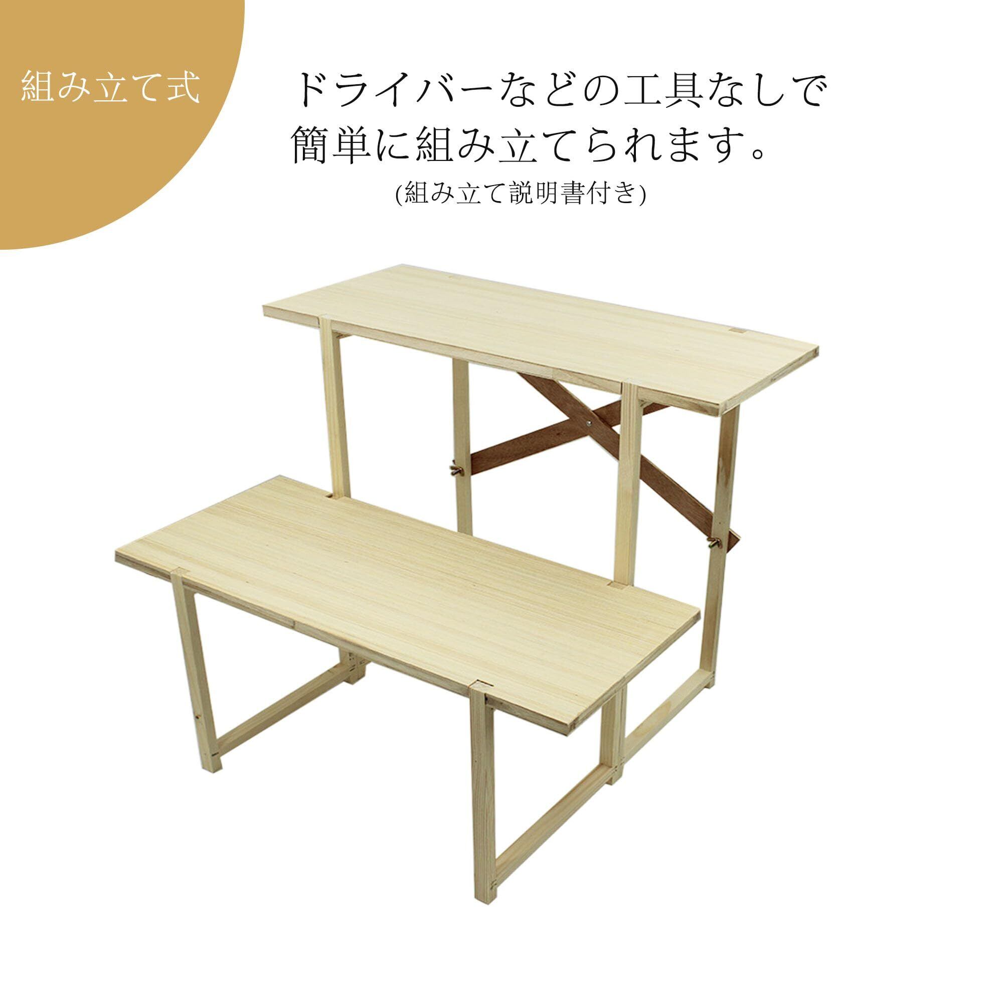 二段祭壇は、サイズ約巾60x高50x奥行50cm、上下二つの段で構成されており、上段には神仏や重要な祭具を安置し、下段には供物や装飾品を置くことが一般的です。