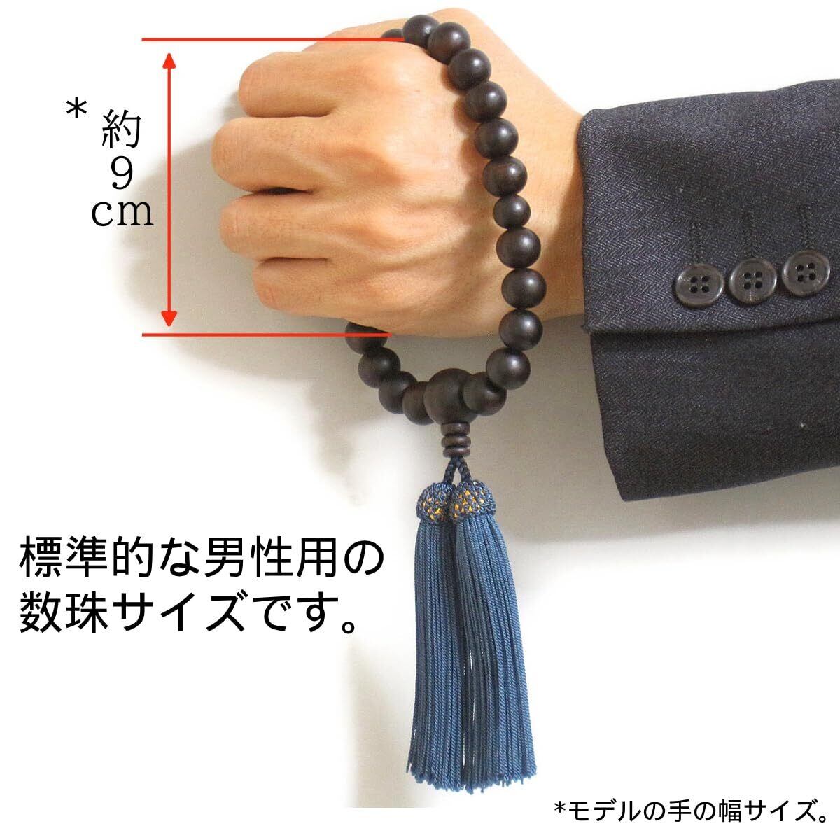 念珠堂 < 日本製 数珠 > 本黒檀 22玉 <数珠袋付> 男性用 国産 手作り 念珠 (房色 鉄紺) 全ての宗派でお使い頂けます