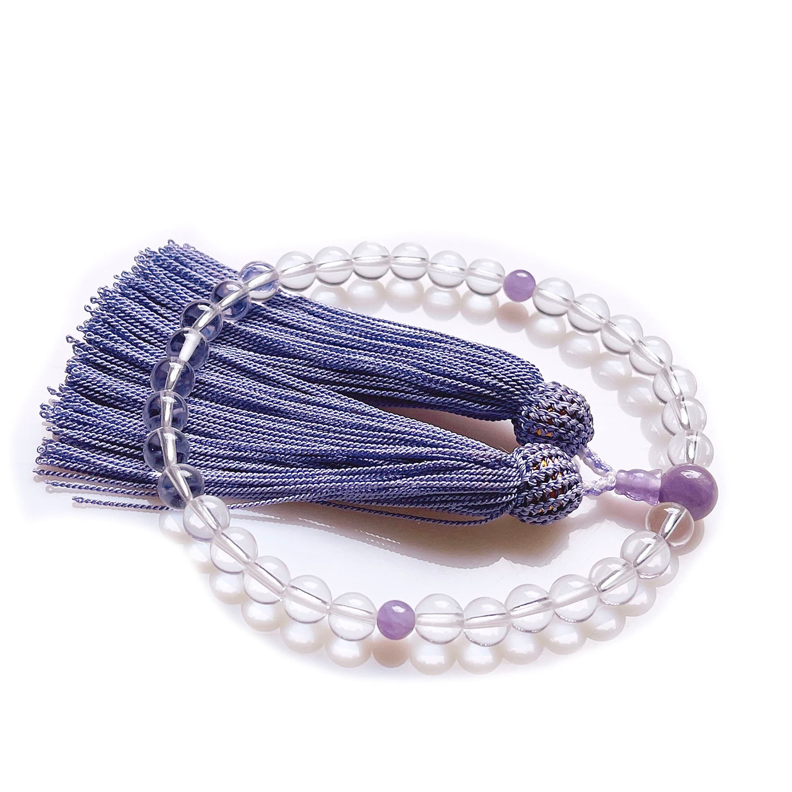 この女性用念珠は、熟練の職人が一点一点丹精込めて手仕上げした高品質な数珠です。親玉には約10ミリの本水晶、主玉には約7ミリの本水晶を使用し、天玉には約5ミリの藤雲石を配しています。房は藤色を採用し、上品な仕上がりとなっています。付属の数珠袋は金襴を使用した念珠入れで、大切な念珠を保管するのに最適です。天台宗、浄土宗、真言宗、浄土真宗、日蓮宗、曹洞宗、臨済宗など、すべての宗派でお使いいただける略式数珠となっており、葬式、葬儀、お通夜、墓参り、お盆、法事、法要、告別式など様々な仏事にご利用いただけます。