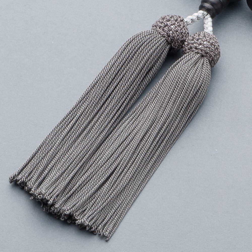 珠の素材:縞黒檀(艶消)22玉/主珠…縞黒檀(艶消)13mm玉/親珠…縞黒檀(艶消)18mm玉/天珠…茶水晶9mm玉/房の素材:正絹頭付房(ねず茶色)/備考:高級ファスナー式数珠袋付き(縦7.5cm×横17.5cm)