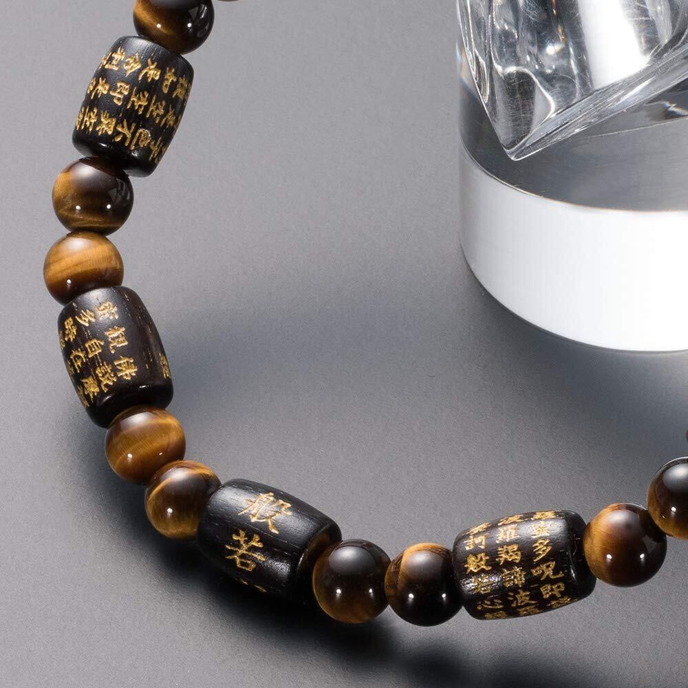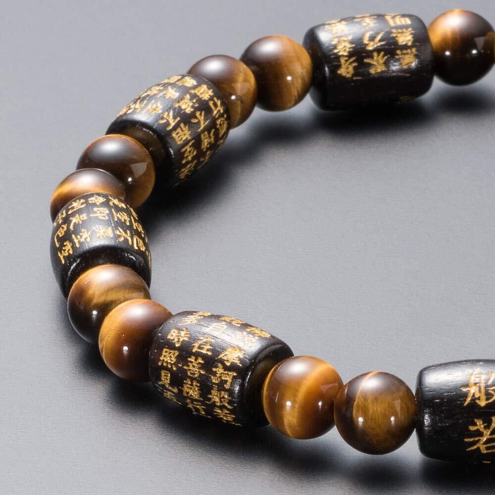 「般若心経」全276文字を彫り込んだ俵型の艶あり黒檀と、独特な模様と艶やかな輝きのバランスが絶妙な虎目石を組み合わせた腕輪念珠(ブレスレット)です。艶あり黒檀は人気が高く、使い込むほどにしっくりと手に馴染み、深い質感のある光沢になっていきます。