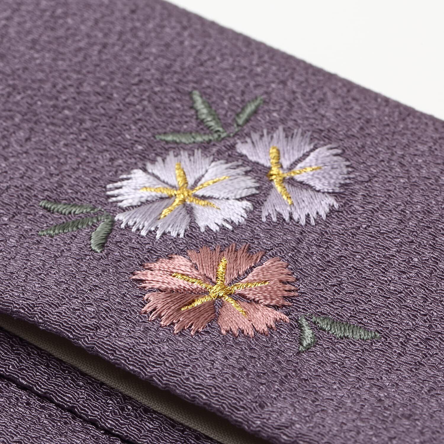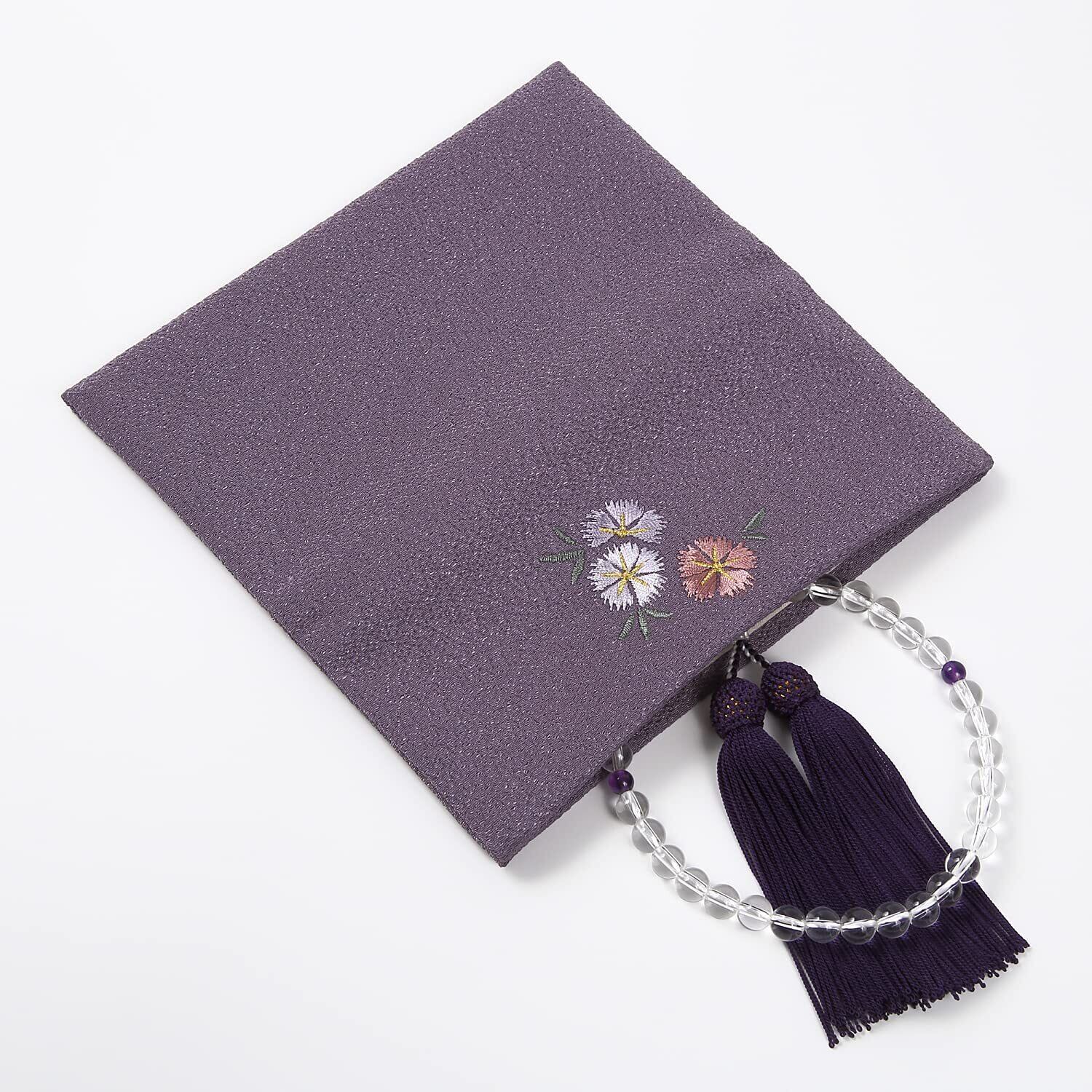 女性用 数珠袋 レディース 二つ折 ちりめん 刺繡入 京念珠 念珠入れ ポーチ ケース 外箱付 日本製/紫 パープル ( 撫子 )