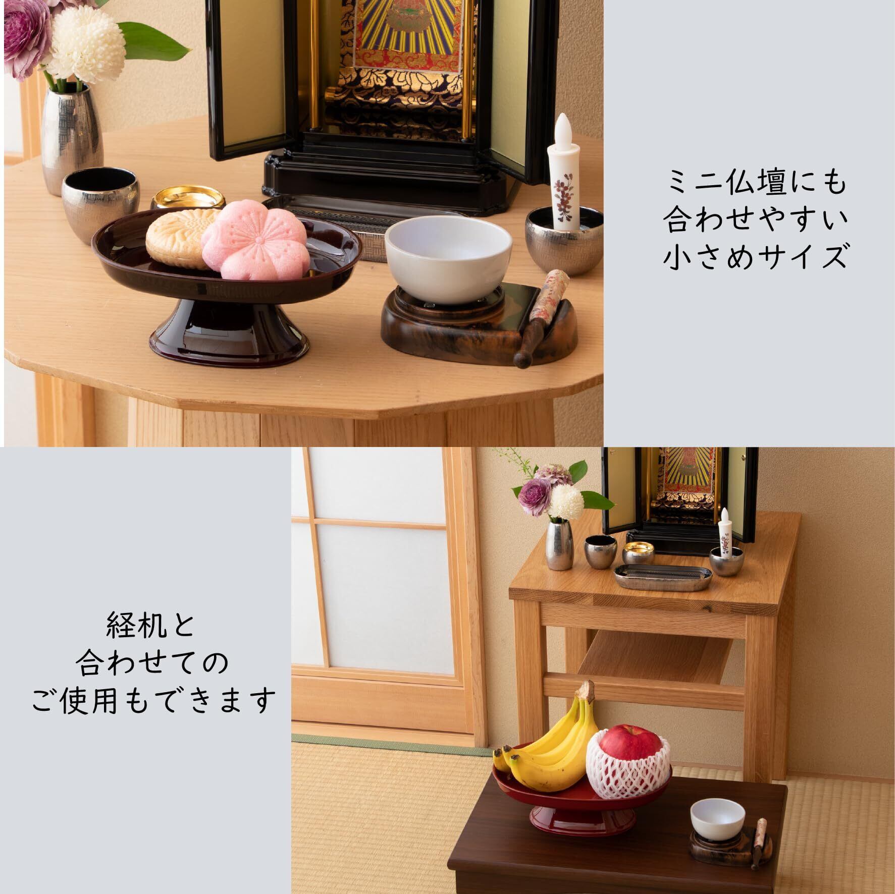 この供物台は、シンプルかつ伝統的なデザインと、職人の手による塗りによって生み出される高級感ある質感が特徴です。伝統的なお仏壇へのお供えはもちろん、ミニ仏壇や、リビングのステージ仏壇などへのお供えにもお使いいただけます。大切なお祈りや供養の場に、ぜひお使いください。