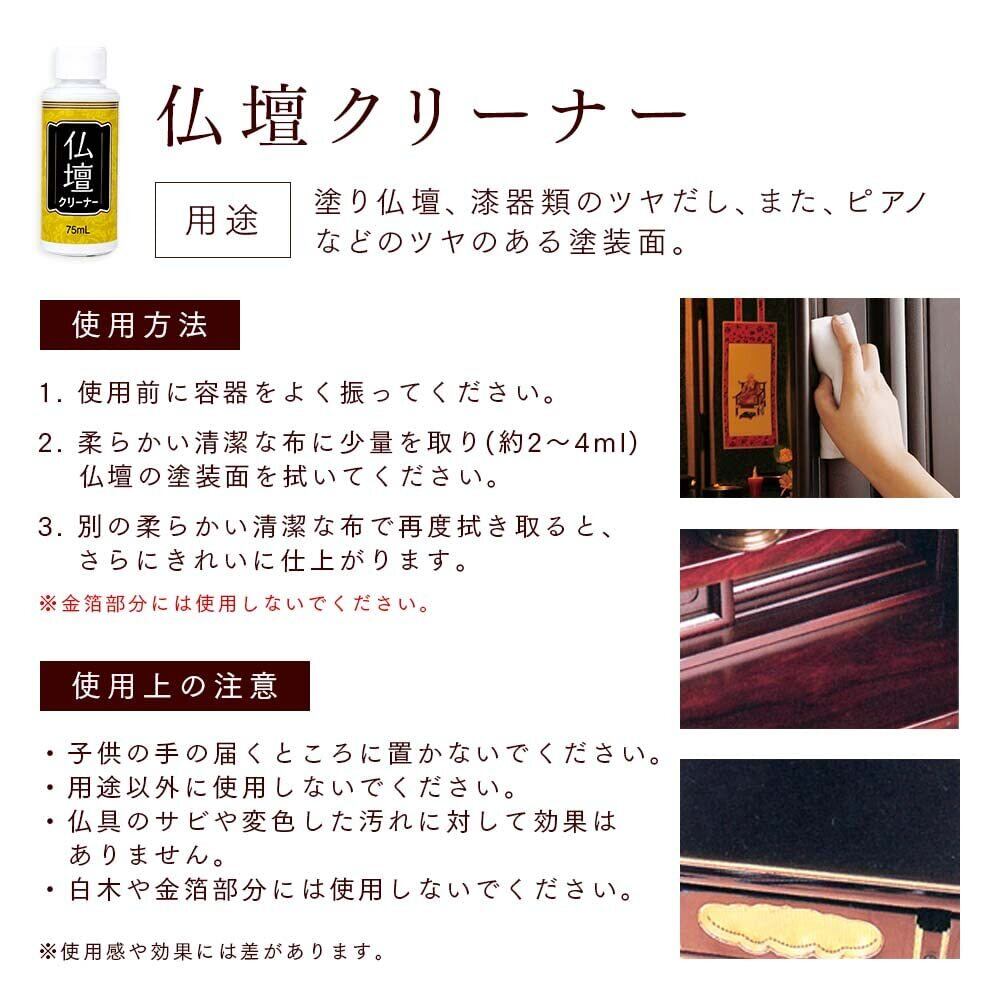 1.使用前に容器をよく振ってください。2.柔らかい清潔な布に少量を取り(約2~4mL)、仏壇の塗装面を拭いてください。3.別の柔らかい清潔な布で再度拭き取ると、さらにきれいに仕上がります。(金箔部分には使用しないでください。)