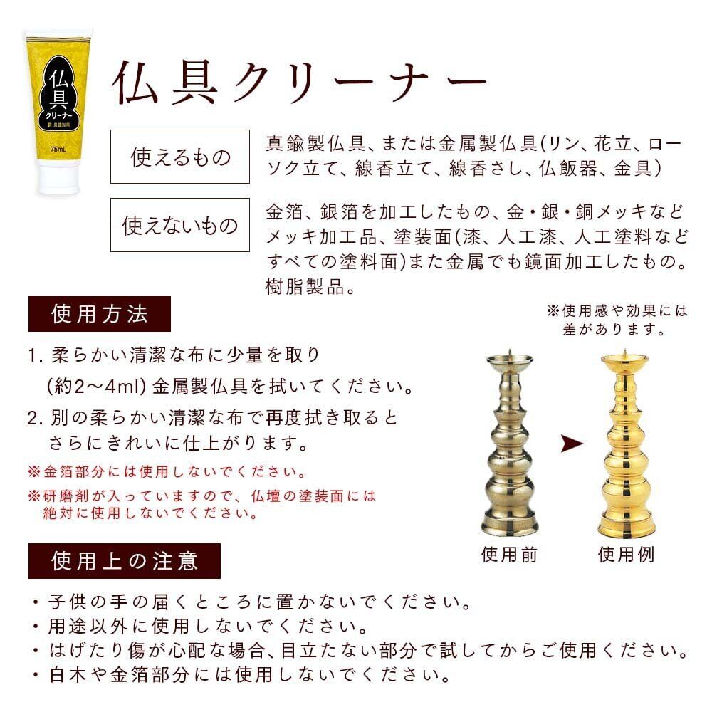 <b>その他 :</b> ●使用量の目安:仏壇、仏具とも4ml(1平方m) ●仏具クリーナーの液性:弱アルカリ性●仏具クリーナーが使えるもの:真鍮製仏具、または金属製仏具(リン、花立、ローソク立て、線香立て、線香さし、仏飯器、金具)