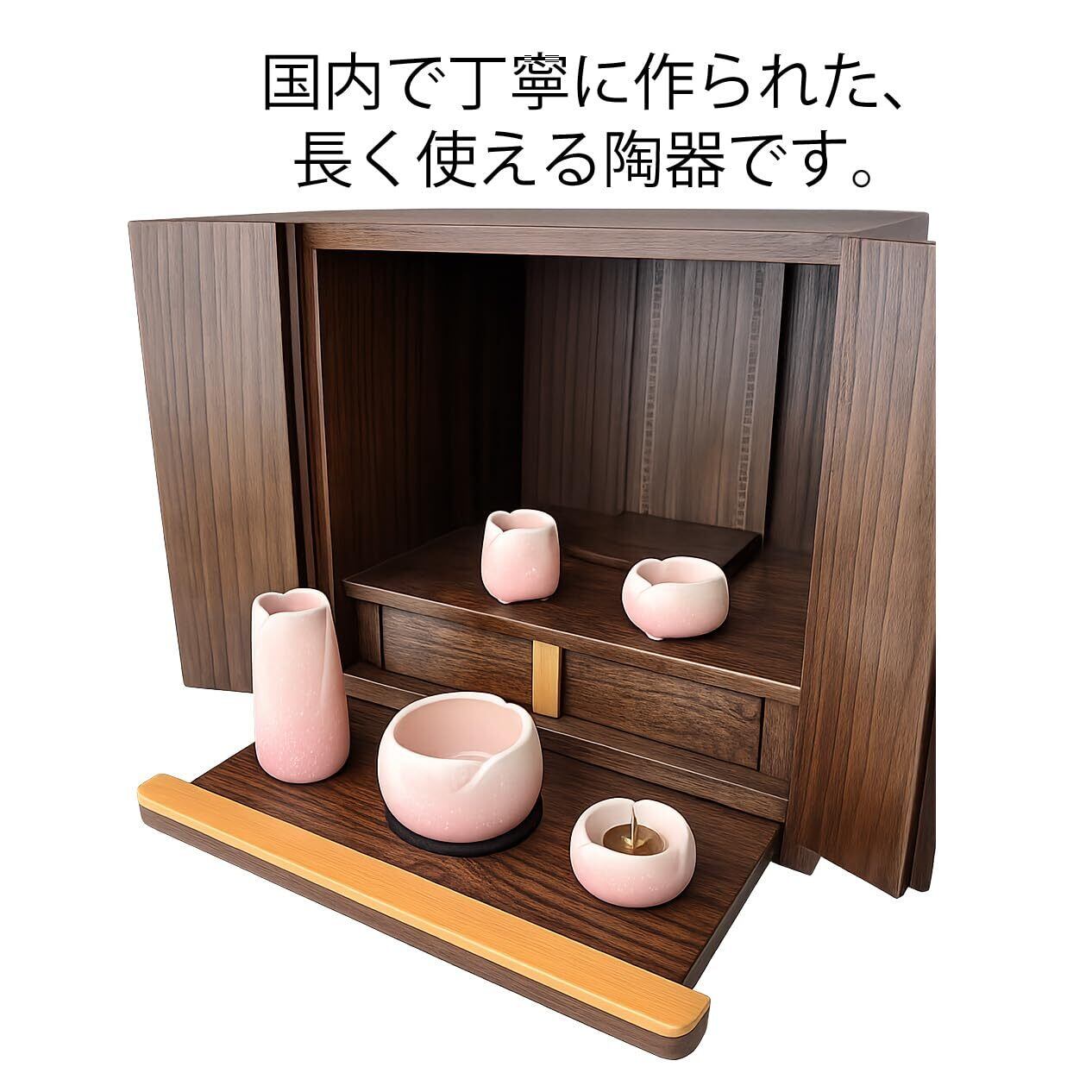 やさしく淡いピンク色が印象的な仏具セットです。 主張しすぎない柔らかな色合いで、伝統的なお仏壇から現代的な仏壇まで、どんな空間にも自然に調和します。 国産陶器ならではの丁寧な作りで、ひとつひとつ滑らかな質感と安定感を感じられる仕上がり。 毎日のお参りに、穏やかな気持ちを添えてくれる仏具です。