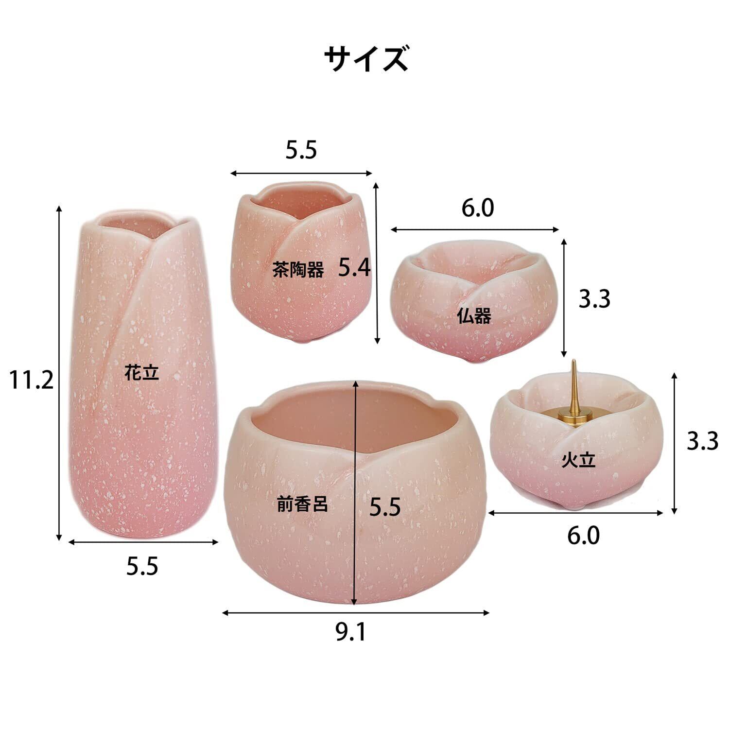 【仏具5点セット】 材質:陶器製 カラー:ピンク 内容:花立 火立 香炉 仏器 湯呑 灰 敷フェルト