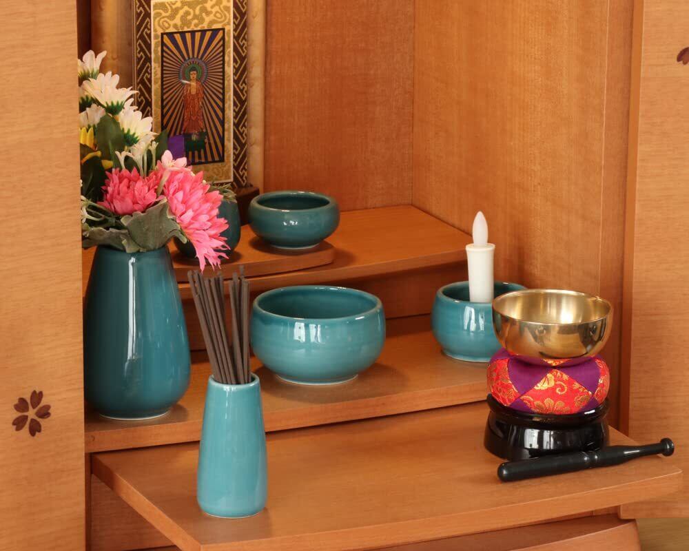 なーむくまちゃん工房 仏具セット 陶器 6点+おりんセット 香炉灰付 モダンミニ仏壇用 もみじ ターコイズ set
