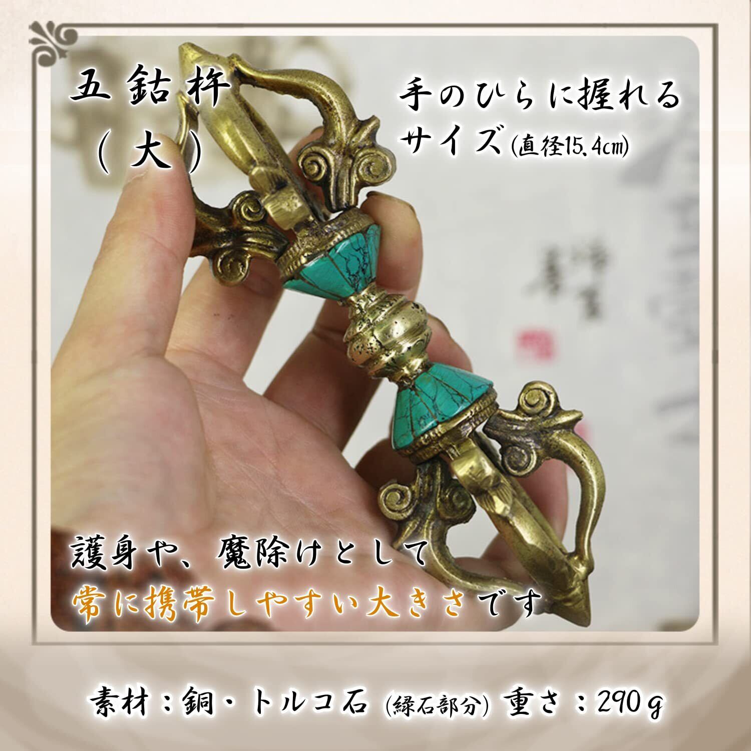 ■代表的な密教法具として知られる「五鈷杵(ごこしょ)」。金剛杵の一種として中国より伝わり、日本では弘法大使空海も所持していたといわれています。■元々武器としての役目があったのち、仏の智慧(ちえ)の徳を表わす法具となり、護身や魔除け厄除けとして、またあらゆる煩悩や苦悩を破壊するとされています。■常に持ち歩くことを想定し、大人の手のひらで握りやすい15cmサイズの「五鈷杵(大)」と、ペンダントタイプで身体に直接身に着けられる4cmほどの「五鈷杵(小)ペンダント」をご用意しました。■当商品は、「セットでの販売」と「単品でも販売」しております。貴方に合うかたちで常にお手元に携帯していただく事が出来ます。■メイン素材:【五鈷杵(大)】銅・トルコ石/本体重さ:約290g 、【五鈷杵(小)ペンダント】銅・ペンダント用紐付き/本体重さ:約5g