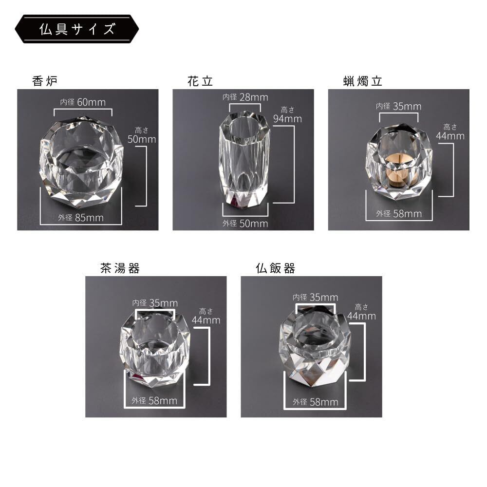クリスタル仏具:香炉、花立、仏飯器、茶湯器、蝋燭立て、線香立て 2.5寸