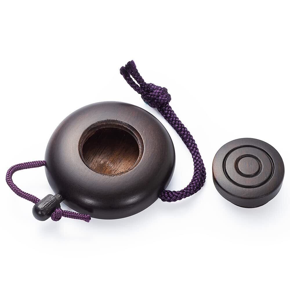 黒檀をくりぬいて作られた携帯にも便利な塗香入れです。上部のネジ式の蓋を外して塗香を入れ、横の栓を抜いて手に少しずつ出してお使いください。