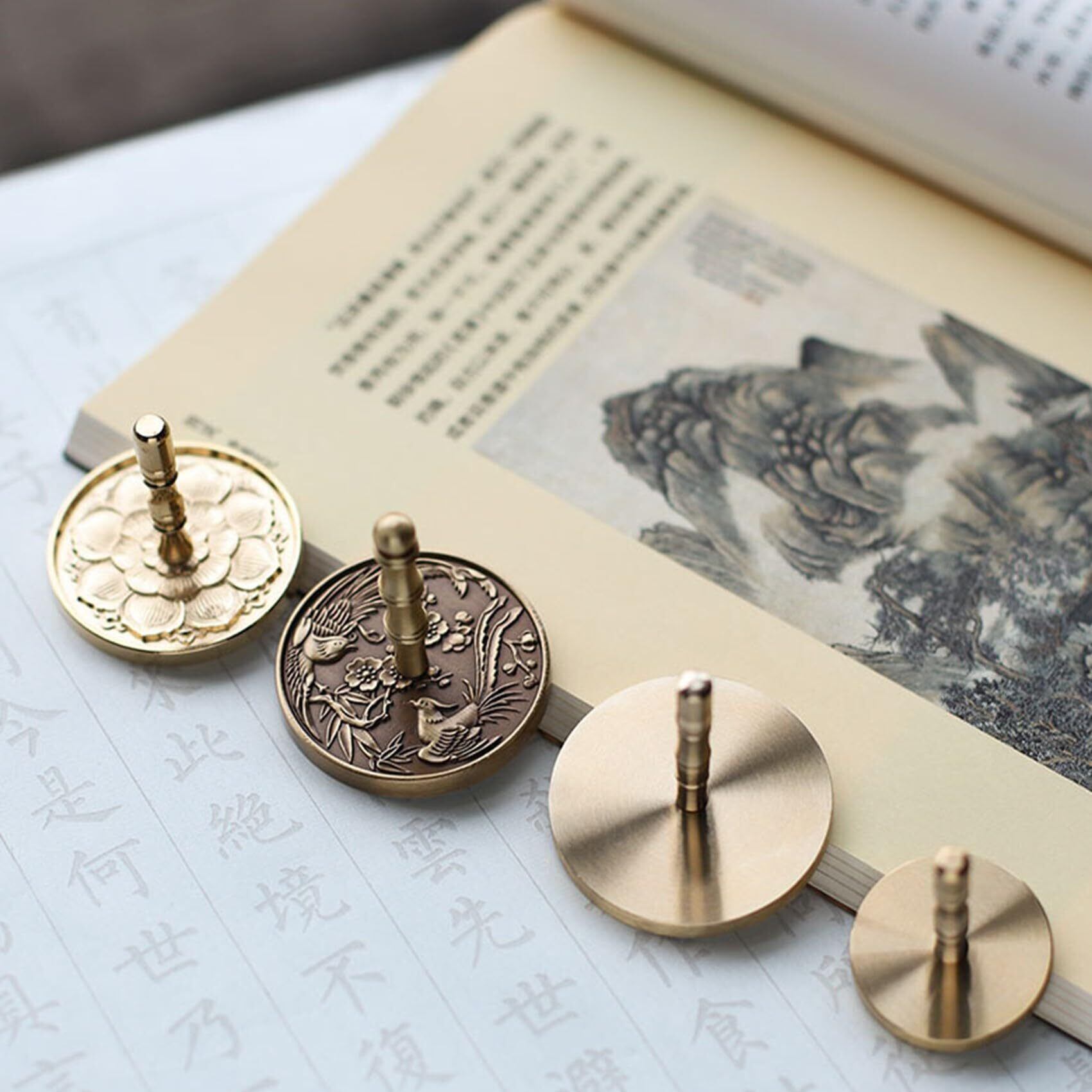 商品詳細:灰押さえ(香灰ツール)【デザイン】 4種 不死鳥二羽 / 龍&不死鳥 / 鳳凰&牡丹 / 九龍 【材質】 銅 【SIZE】 直径5cm×高さ4.8㎝