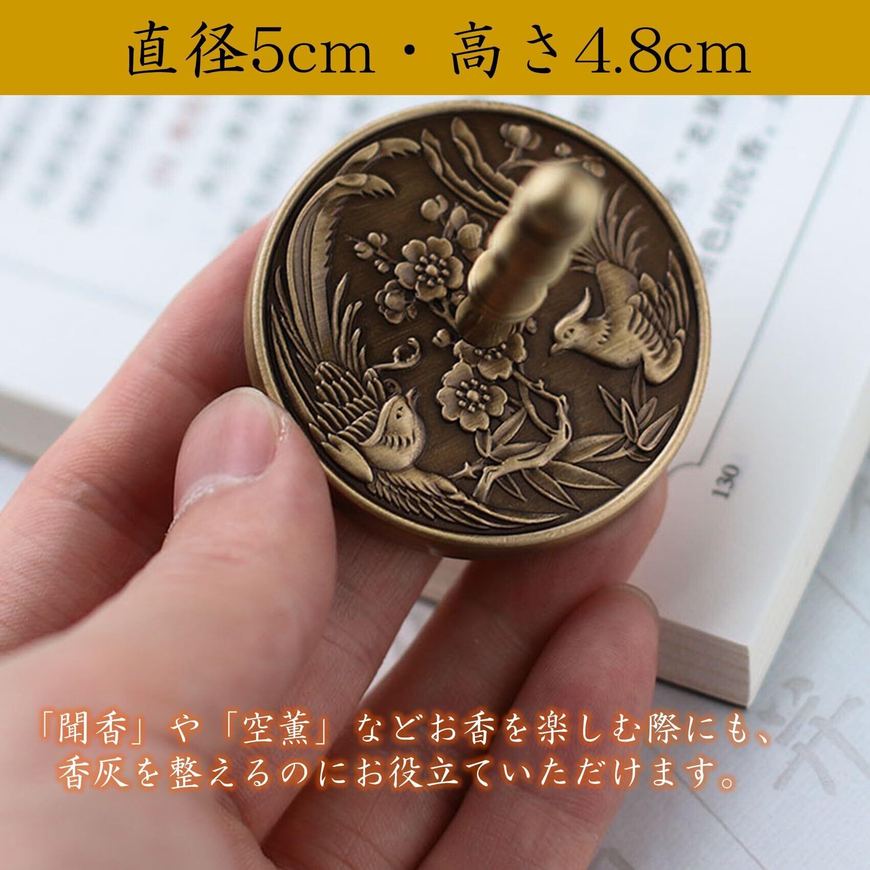 灰押さえのサイズは直径5cm、持ち手を含めた高さが4.8cmです。法要や供養、お墓参りやお仏壇へのお供えなどの実用から、聞香や空薫などお香を楽しむ際にも香炉灰を整えるのにお役立ていただけます。