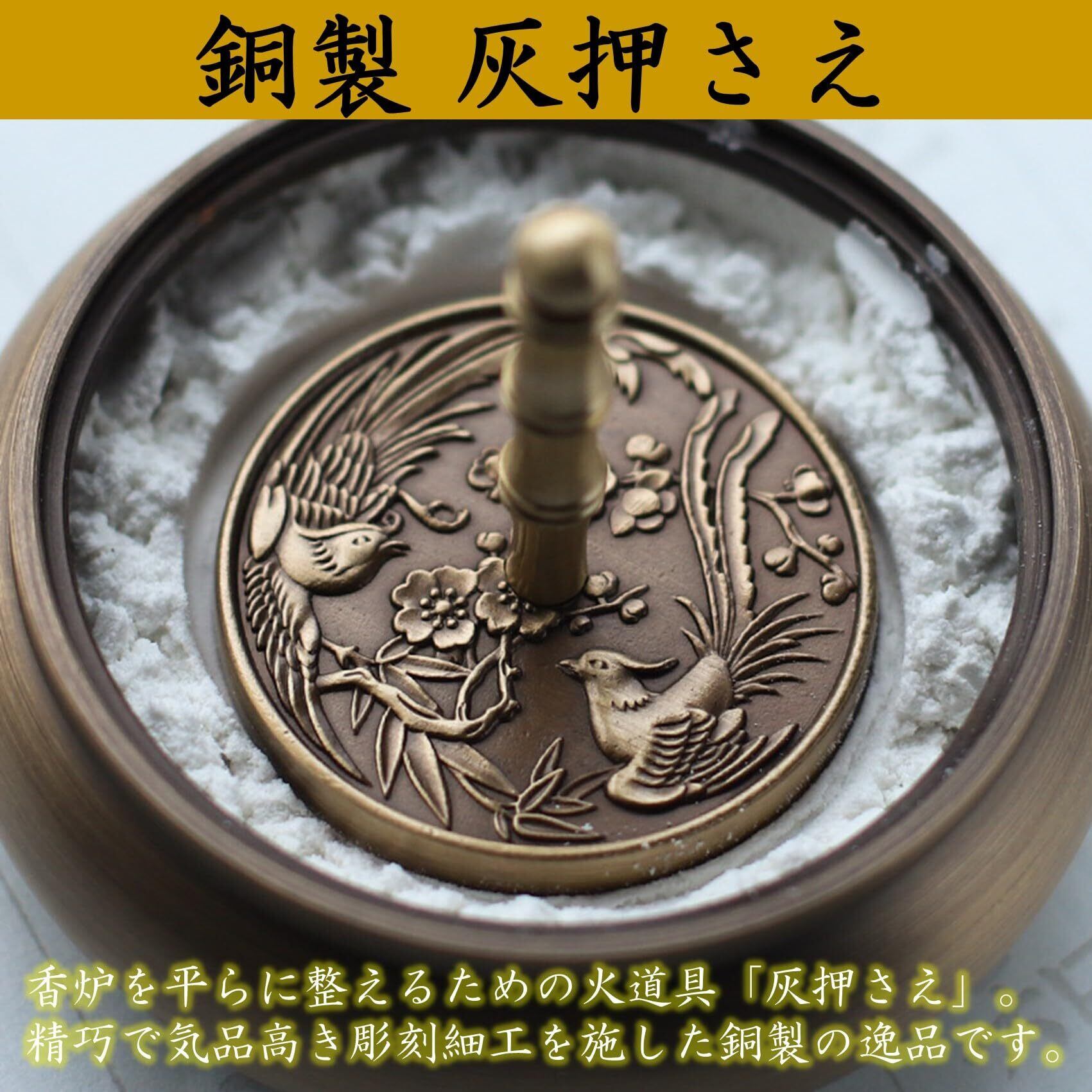香炉灰や火鉢などの灰を平らに整える香灰ツール灰押さえです。銅に聖獣を彫刻したアンティークな灰押さえは、香道や法要など静穏な雰囲気をより高尚に演出します。不死鳥二羽、龍&不死鳥、鳳凰&牡丹、九龍、4種のデザインをご用意いたしました。