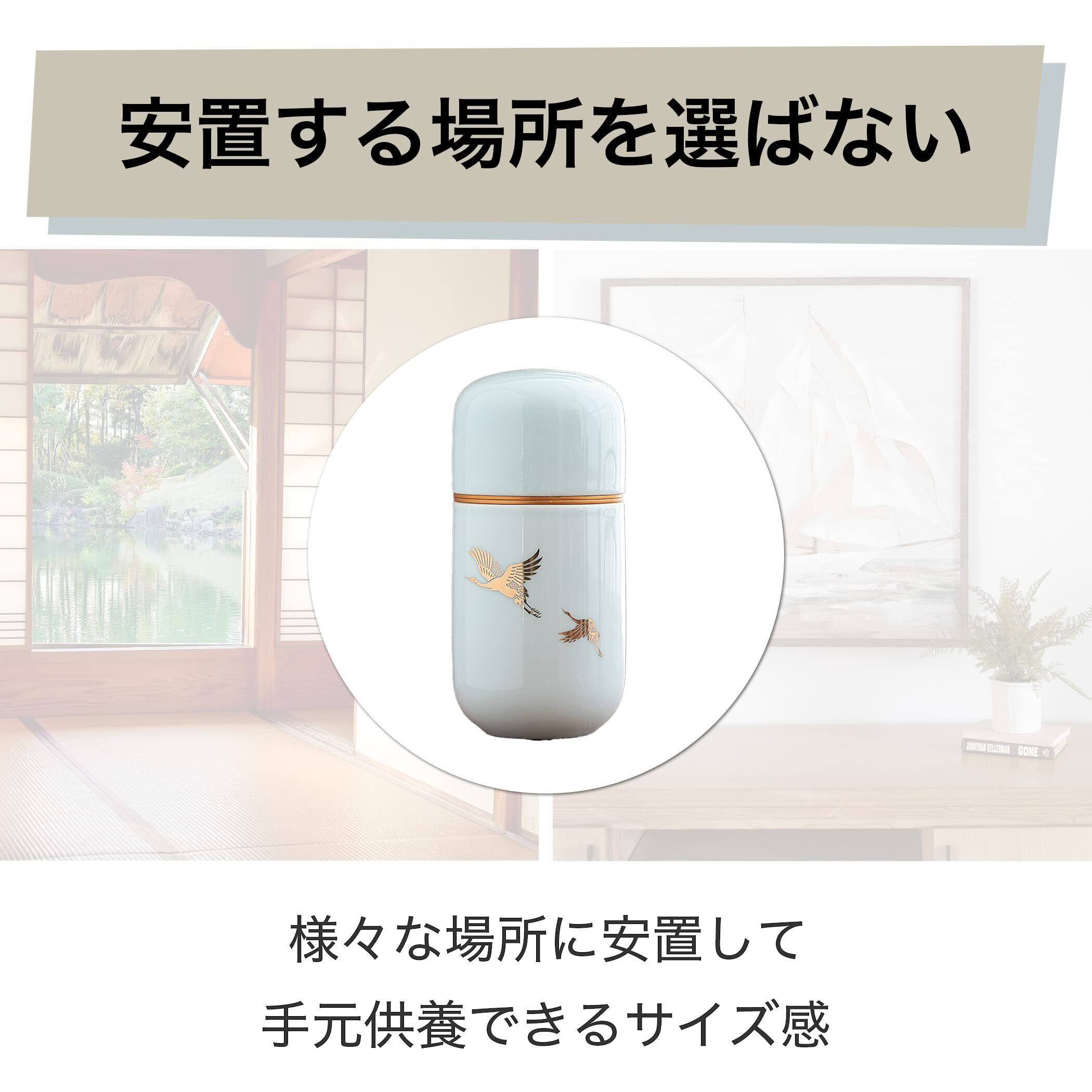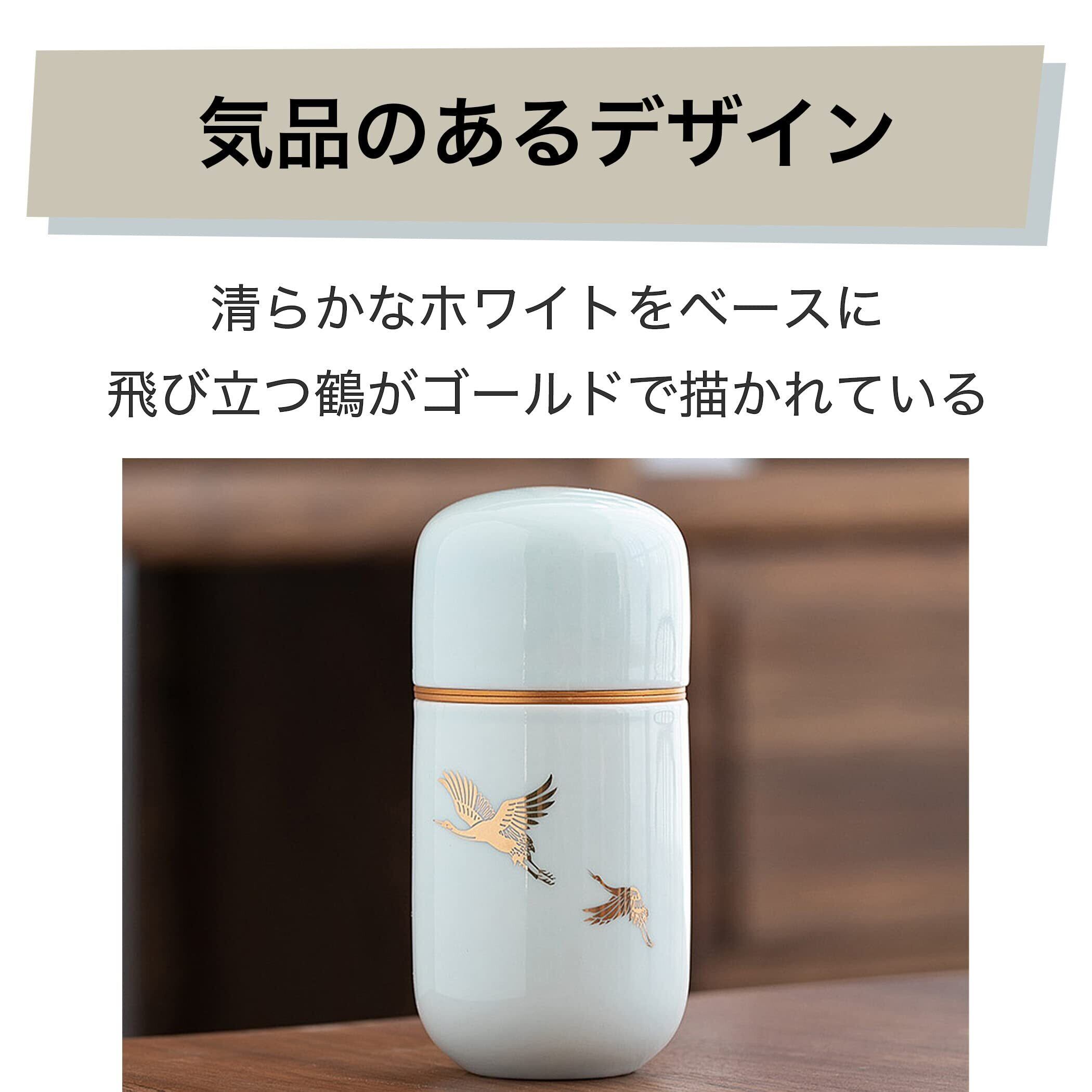 気品のあるデザインで手元供養にピッタリ:清らかなホワイトカラーをベースに、飛び立つ鶴がゴールドカラーで描かれています。仏壇にもさりげなく置きやすい骨壺で、大切な方との思い出と遺骨を優しく包み込んでくれることでしょう。