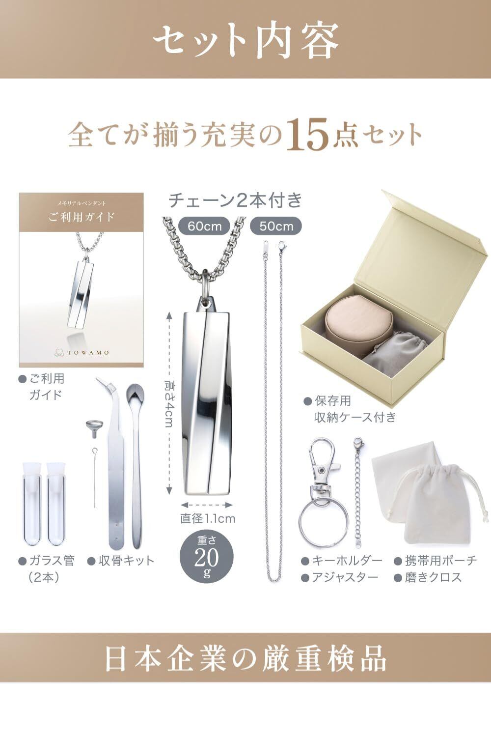 【全てが揃う15点セット】 キーホルダーパーツ付属でカバンなどに取り付けて、いつも一緒にお出かけすることができます。 遺骨ペンダントとして着けないときはペンダントケースに入れて飾り、手元供養することができます。 末長いご使用を想定し、予備のガラス管・磨き布・携帯用ポーチ・保存用ボックスなど必要なものが全て揃う充実の15点セット。 ご購入後のアフターケアも迅速に対応させていただきます。