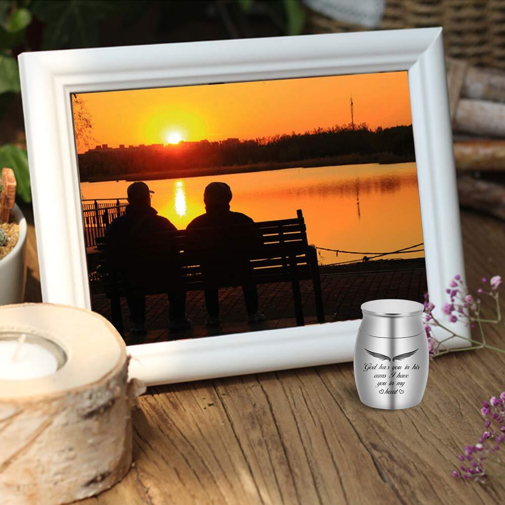 デザイン:本体に翼柄、「God has you in his arms I have you in my heart」があります。ミニ骨壷、お墓が遠くてなかなかお参りに行けない方、分骨して一部を手元に置いて、場所を取らず、ずっと置いておけます。
