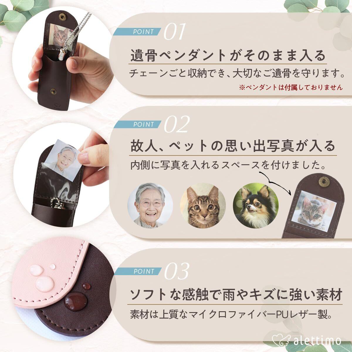 【大切なご遺骨をしっかり守る】衝撃などによるキズ 、汚れ、落下による紛失から守ります。 【写真ポケット付き】ケースの内側にお気に入りの写真を入れられるため、いつでも見ることができます。 【他人に気づかれにくい】バッグ キーホルダー ズボン ランドセル などでも、他人に気づかれることなくさりげなく着けられます。 【外出先で外す時も】旅行、温泉、仕事などで急に外さないといけない時でも、ケースがあれば安心して保管出来ます。 【30日間無料保証】初期不良はもちろん、不具合などございましたら交換、返品等ご対応させて頂きます。ご安心下さいませ。