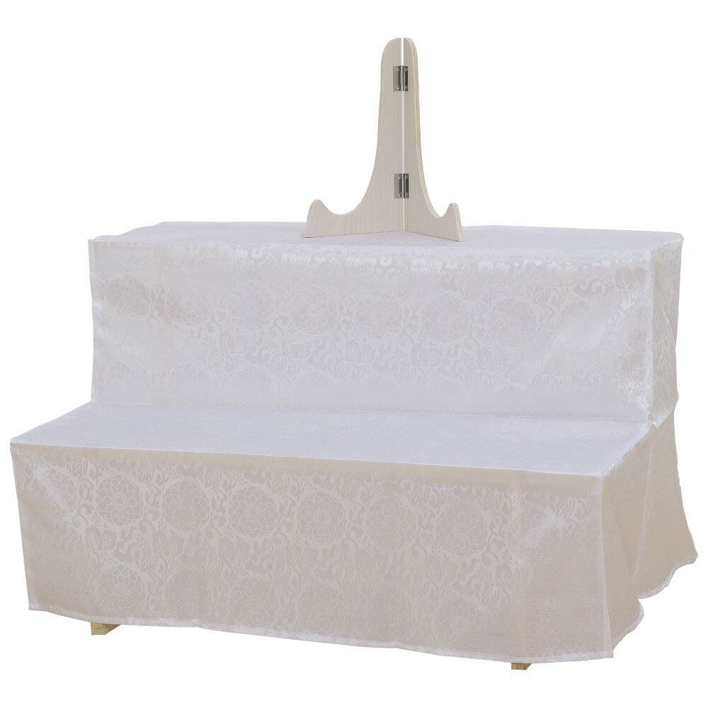 立体に縫製された美しい白布付きです。祭壇に合うように立体縫製されているので、上からかぶせるだけで簡単にかけられます。側面にも白布がしっかりかかるので、横から見ても直接本体の骨組み見えないすっきりとした仕上がりになります。