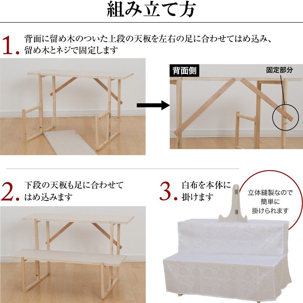 寸法:巾84cm×高さ52cm×奥行55cm/細部寸法:1段目高さ27cm、2段目高さ25cm、1段目奥行27cm、2段目奥行27cm/重さ:約3kg/材質:木製/備考:組み立て式(説明書付)、白布付き、写真立て付き(高さ29.5cm)