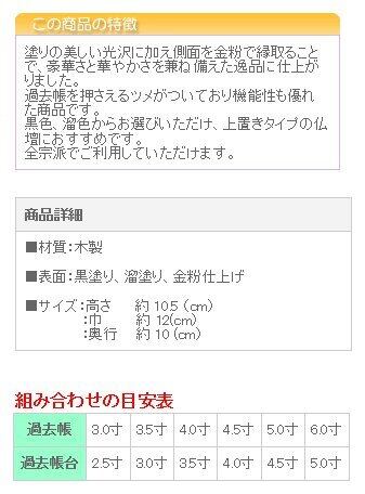 塗りの美しい光沢に加え側面を金粉で縁取ることで、豪華さと華やかさを兼ね備えた逸品に仕上がりました。 過去帳を押さえるツメがついており機能性も優れた商品です。 黒色、溜色からお選びいただけ、上置きタイプの仏壇におすすめです。 全宗派でご利用していただけます。