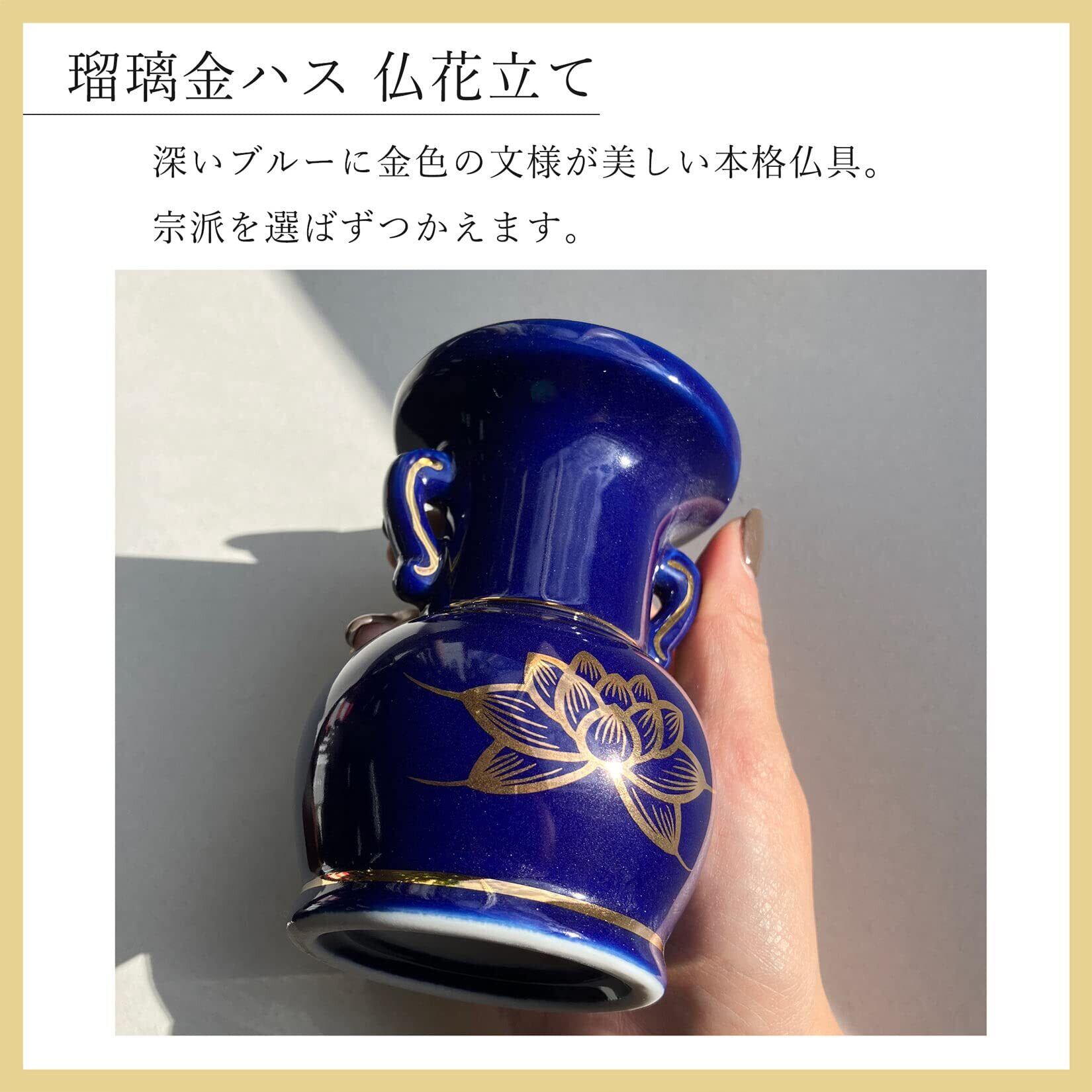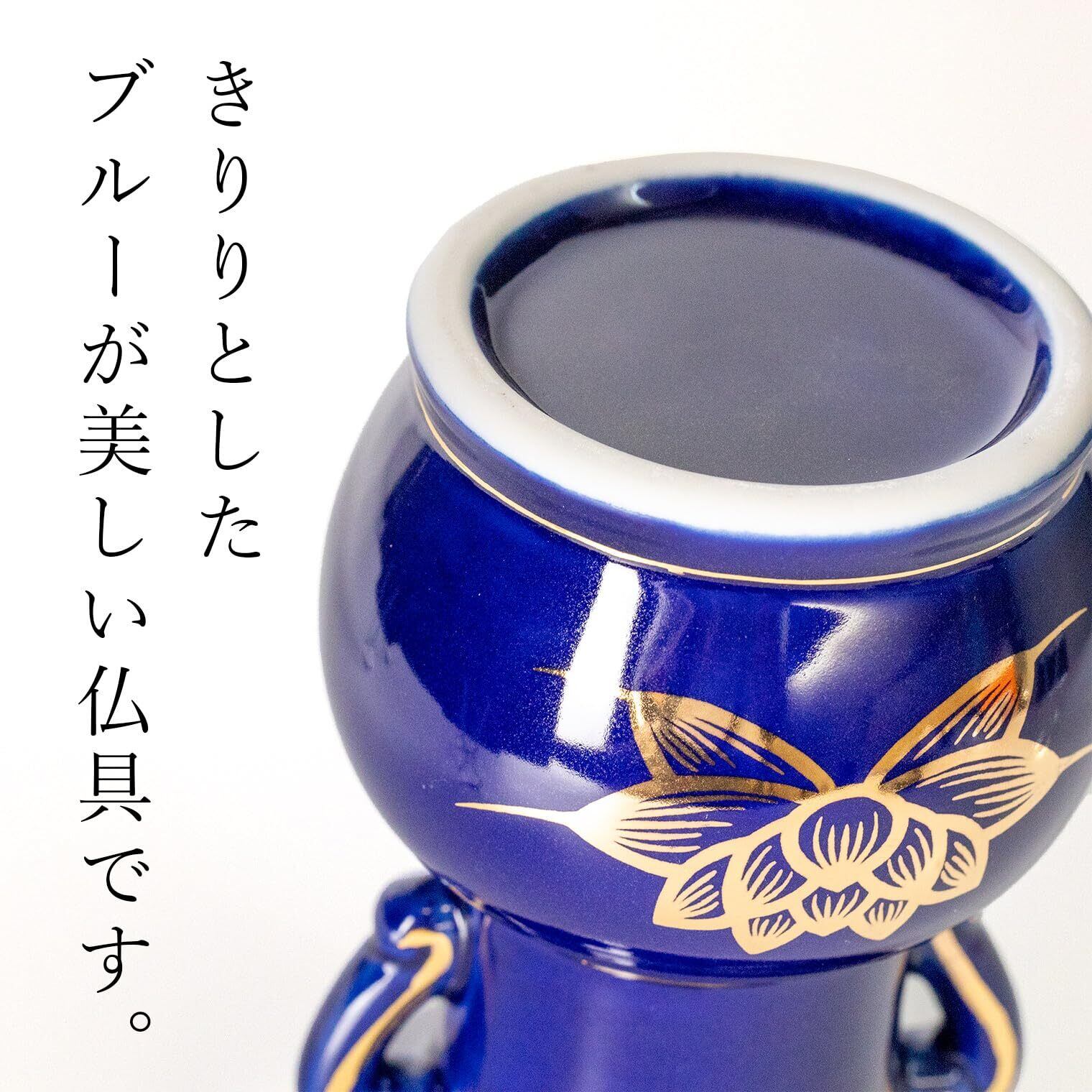 【美しい瑠璃色の本格派仏具】美しい瑠璃色がお仏壇を上品に彩ります。きりっとした深いブルーに、金色の蓮と文様がよく映える、美しい本格仏具。お仏壇はもちろん、リビングや寝室などのミニ仏壇やモダン仏具にもよく調和します。