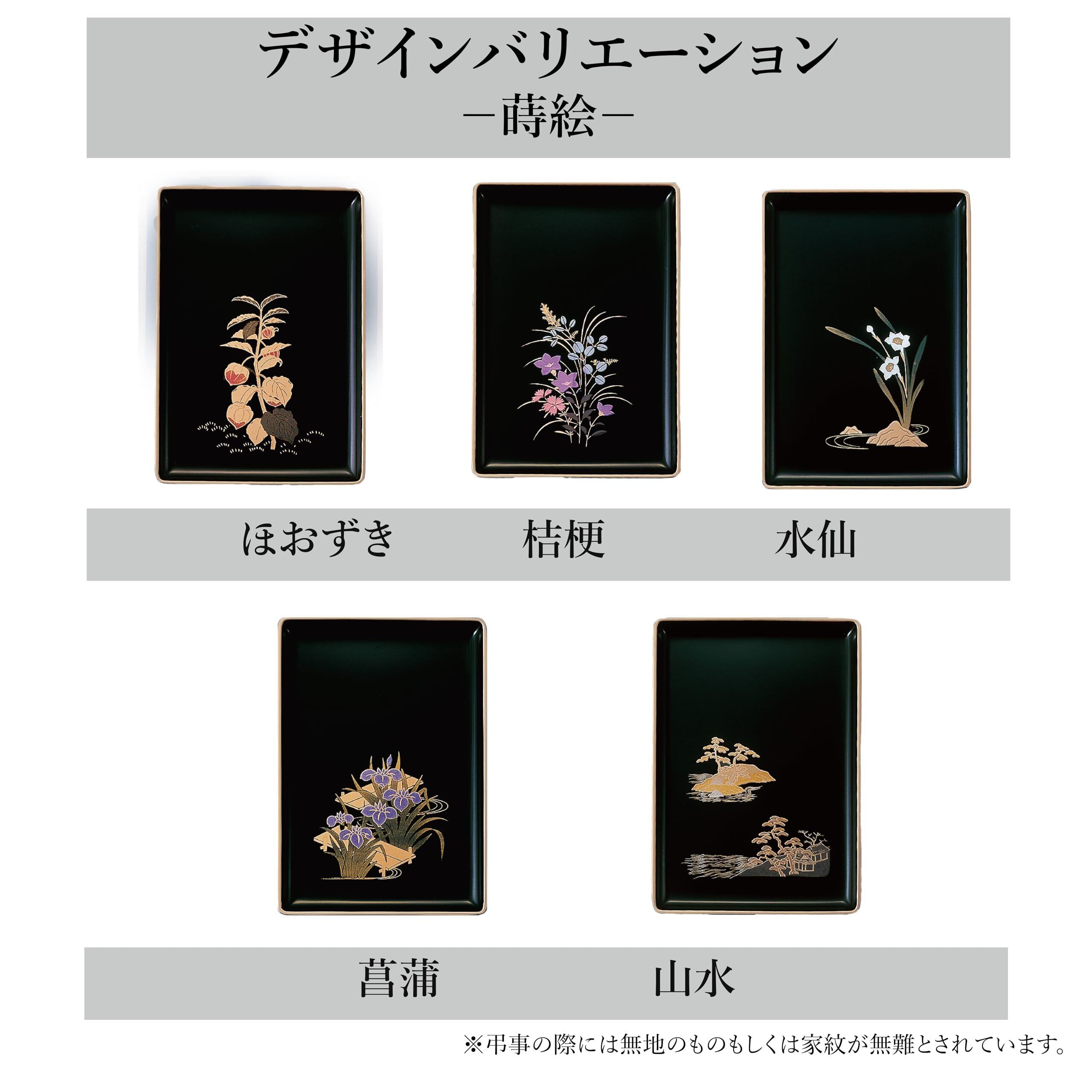 名刺盆の柄はさまざまなものがありますが、弔事の際は無地や家紋入りの落ち着いたものが望ましいとされています。慶事の際は、無地や家紋入りに加えて、図柄や蒔絵入りのものもご使用になれます。鶴や亀などの縁起が良い図柄や、花柄があしらわれた華やかなものまで、さまざまな柄がございます。