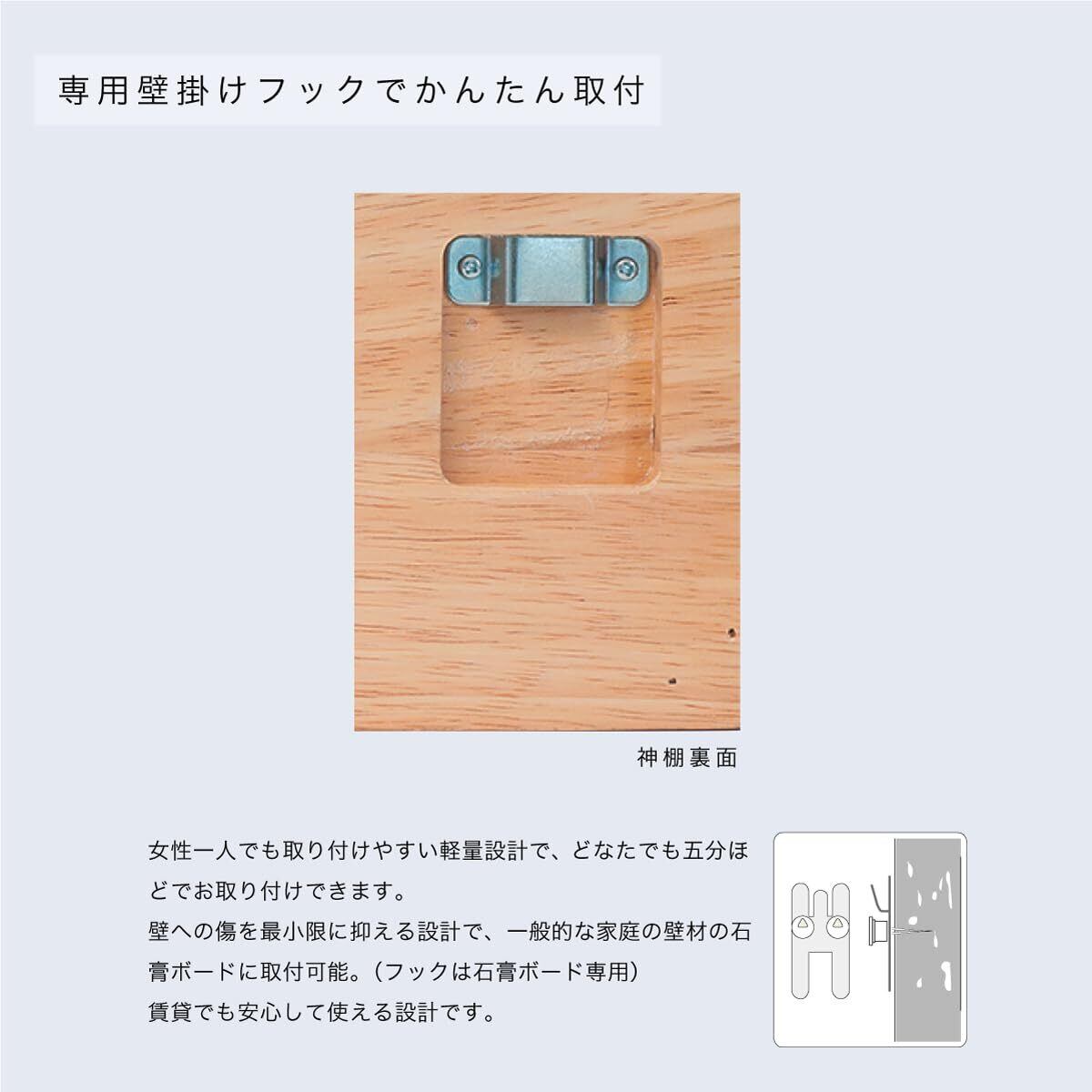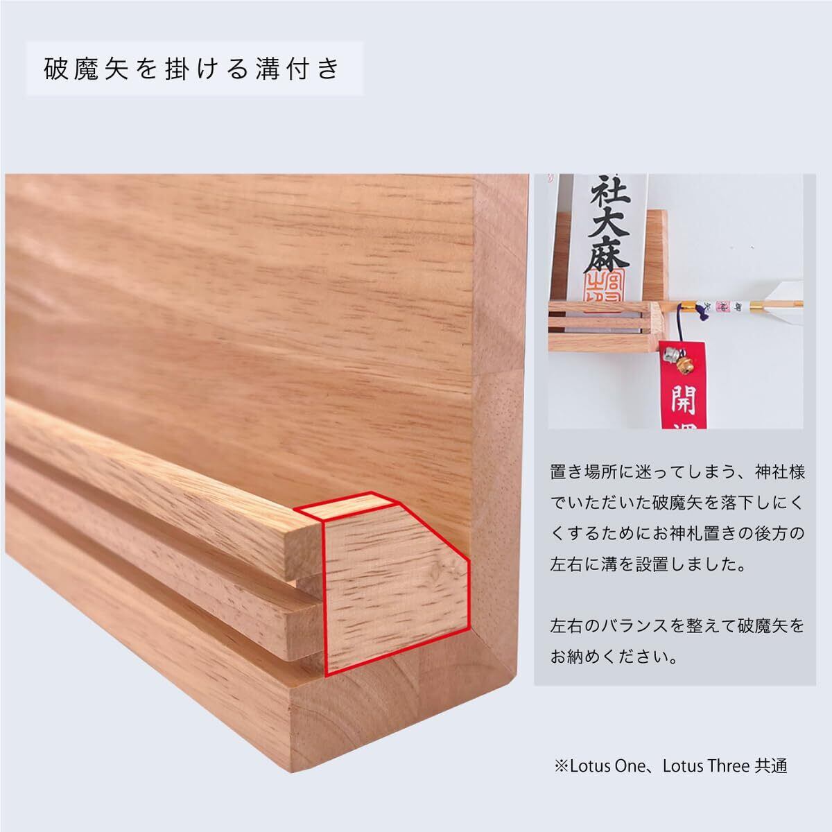 通常配られる頒布大麻を1枚お祀りすることができ、破魔矢も掛けることができます。 置き型としても壁掛けとしてもご利用いただけます。※壁掛け金具付属 -優しく穏やかな木目、滑らかな触り心地- ラバーウッドは材質が優れており、尚且つ他の木材と比較しても安い傾向にあります。 ラバーウッドは天然のゴムを採取した後に使用されている木材の為、環境によい材料としても近年注目を集めています。 ラバーウッドで作られたものとしての代表例をあげると学習机、家具、テーブルがあげられます。