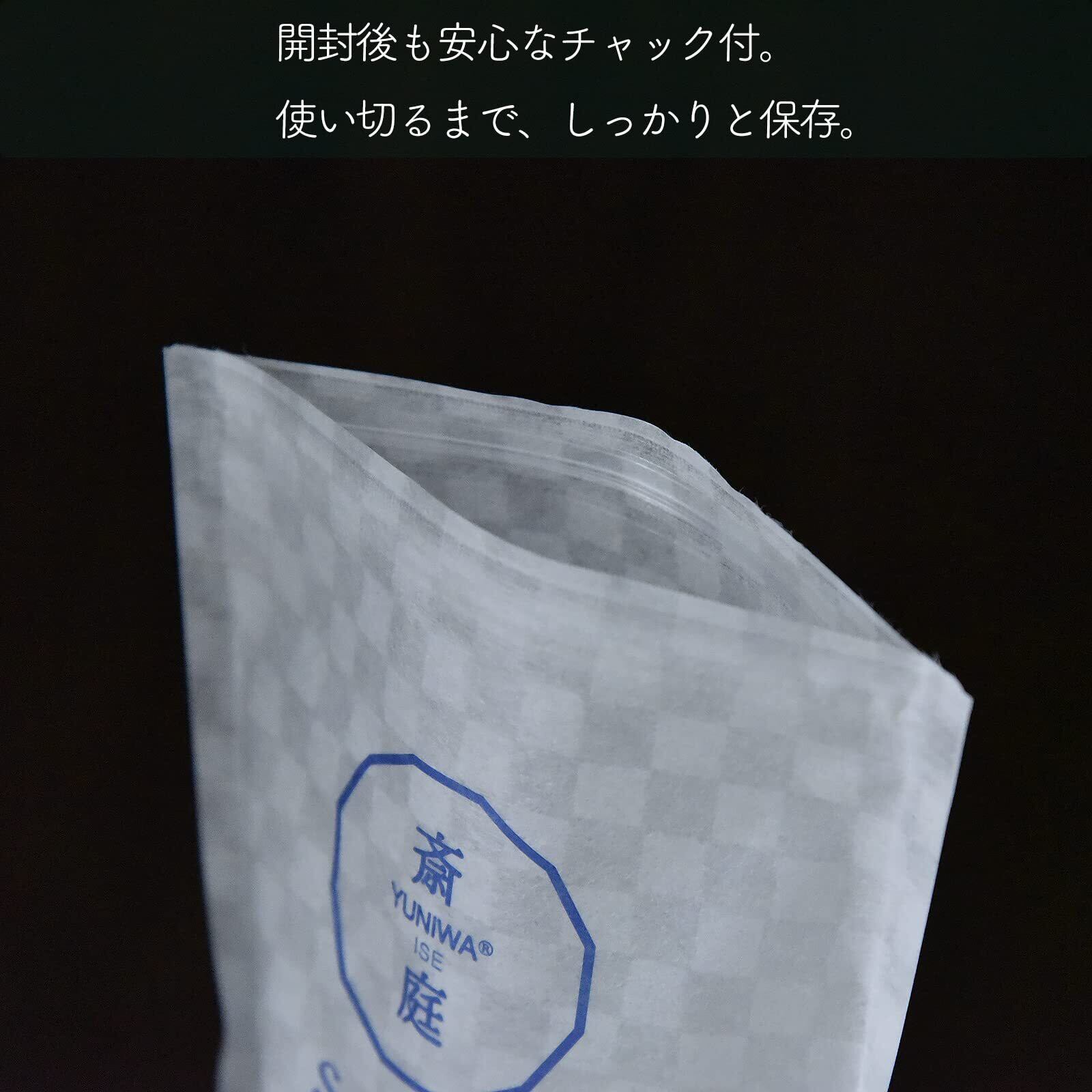 伊勢の神棚神具専門店による 新ブランド YUNIWA 盛り塩や清め塩、日々のお供えのお塩に適した国産塩。 原料:海水 塩の本場 瀬戸内海の恵み。 容量:400g(1袋) 使いきりやすい分量を小分けにしました。 デザイン性も考慮した和紙調の市松柄チャック付スタンドパックを採用。 無理なくご使用いただける価格にもこだわりました。