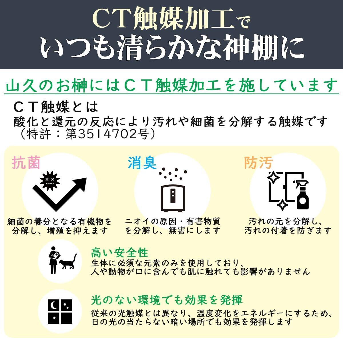CT触媒加工を施しているため、消臭分解、抗菌、空気清浄作用や、榊に埃が付きづらい防汚効果があります。 光触媒加工と異なり、光が当たらない場所でも効果を発揮します。 サイズ:高さ33cm×幅20cm(水上約23cm)