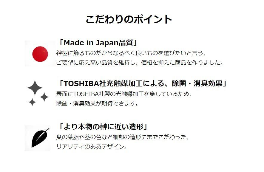 お手入れ不要、造花の榊です。 「もっとリアルなサカキの造花がほしい」 「大切なお供え物だから、安っぽくない方がいい」 などのご要望にお応えし、日本製、Made in Japanクオリティの、 造花榊をお作り致しました! 葉や茎はより本物のさかきに近いデザインで、 美しい葉脈も再現しております。 サカキ全体に光触媒加工済みですので、 除菌や消臭効果も期待できます。 神具や榊立てに真っ直ぐ入りやすいデザインであり、 長さは針金を切ることが出来る枝切りばさみなどで調整可能です。