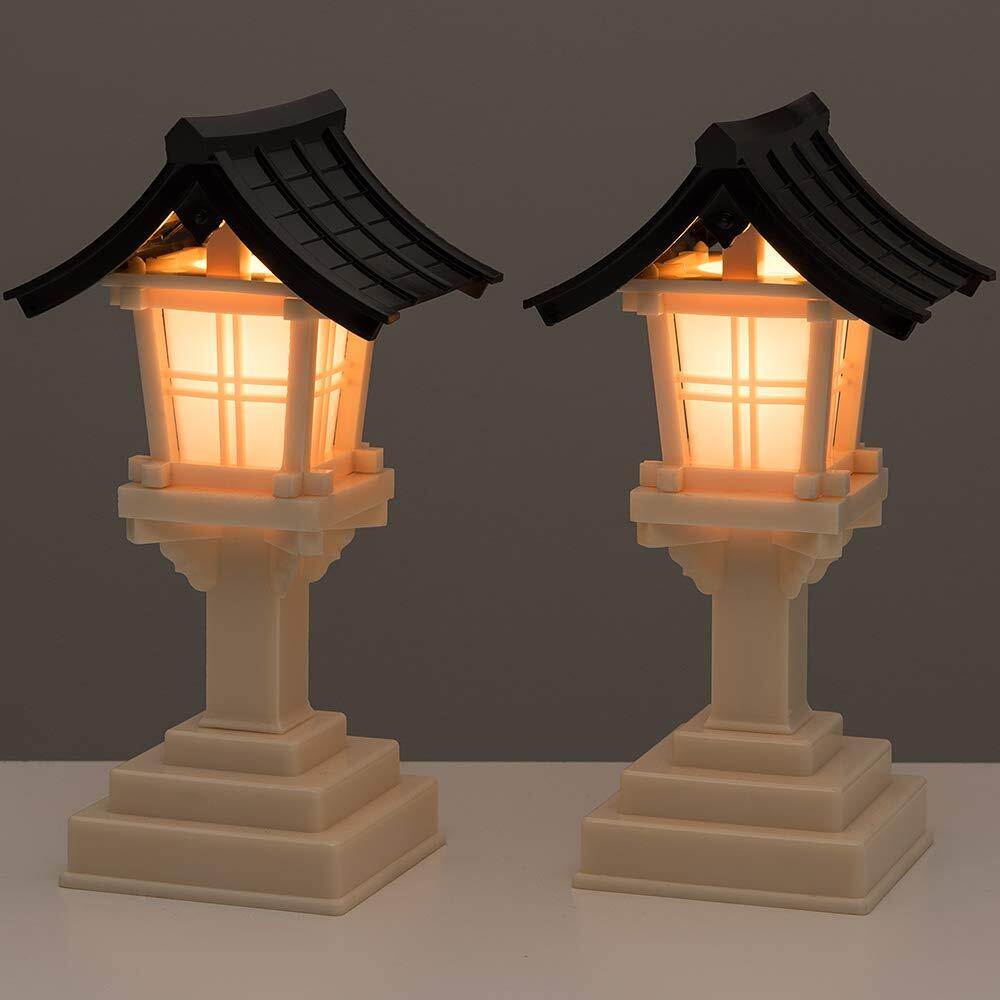 寸法:高さ18cm×屋根巾9cm/材質:樹脂製、屋根黒色/電装:100V電気コンセント用一対コード配線済み/コード長さ:灯篭からコンセントまで-約110cm、2本の灯篭の間-約50cm/備考:中間スイッチなし/生産地:日本製