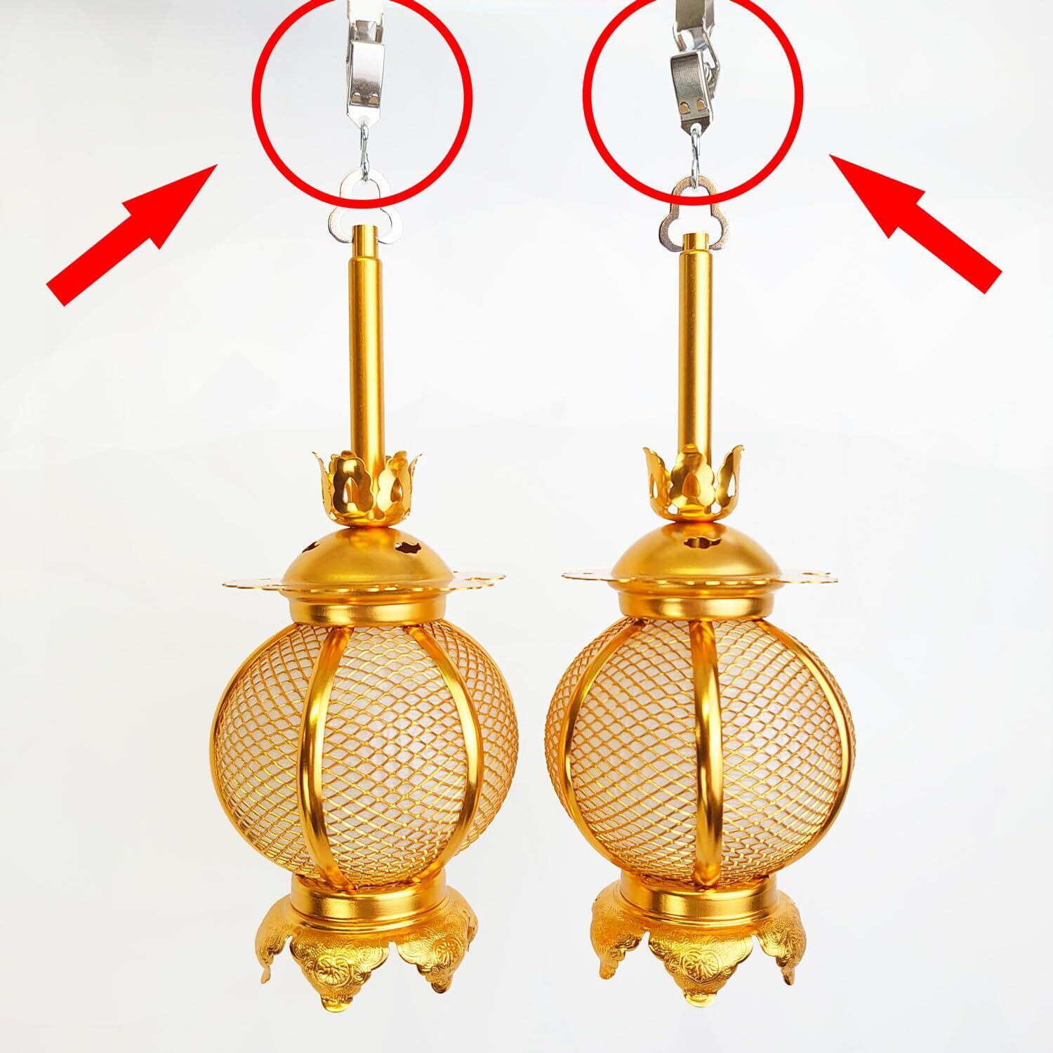・使用方法:クリップを開き、仏壇の天井の格子に挟みます。下がっているS管に灯籠や瓔珞を取り付けてください。