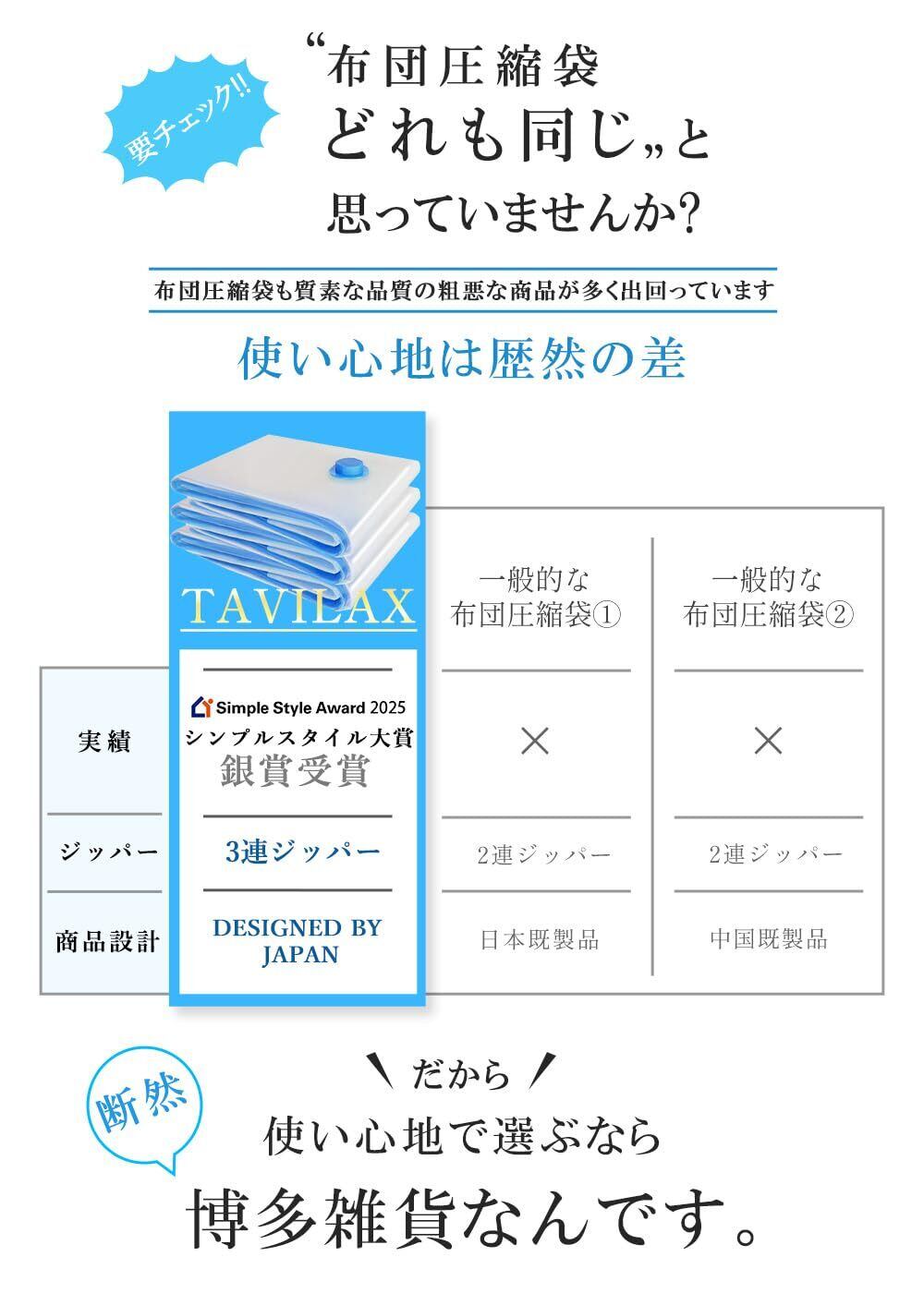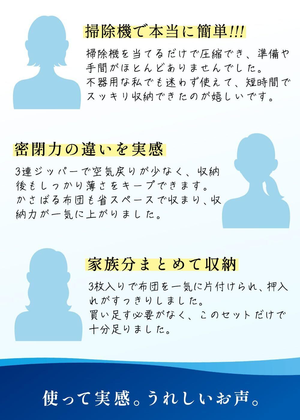 【空気戻りに配慮した3連ジッパー設計】圧縮後の空気戻りをできるだけ抑えられるよう、3連ジッパーを採用。しっかり閉じやすい構造で、長期保管にも適した設計です。
