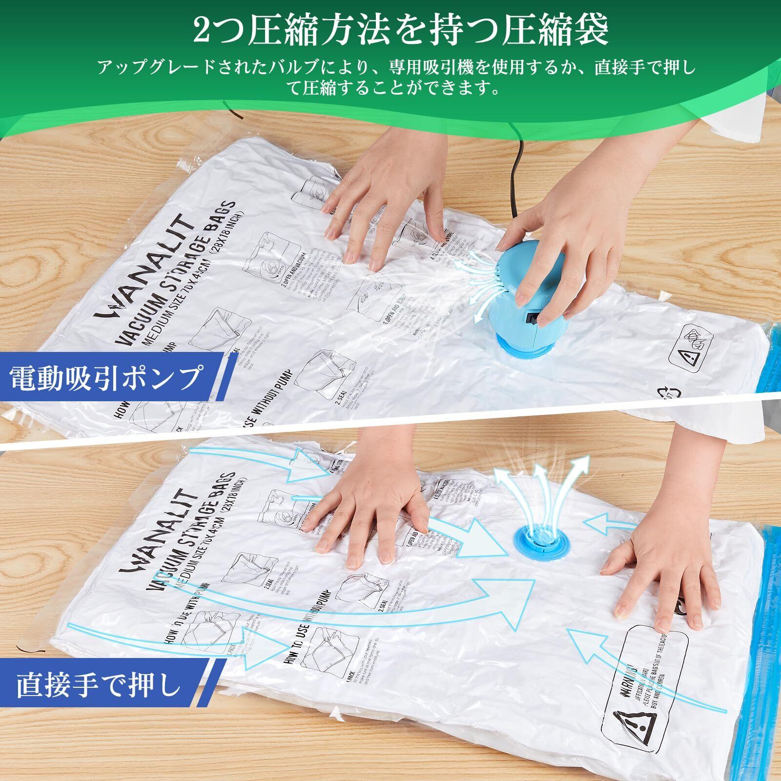 【2つの圧縮方法で使いやすさアップグレード】 キャップレスデザインのバルブ式圧縮袋。付属の電動ポンプで素早く空気を抜く方法と、手で押しながら空気を抜く方法の2通りを選択可能。急いでいる時もゆっくり作業する時も、状況に応じて使い分けられます。