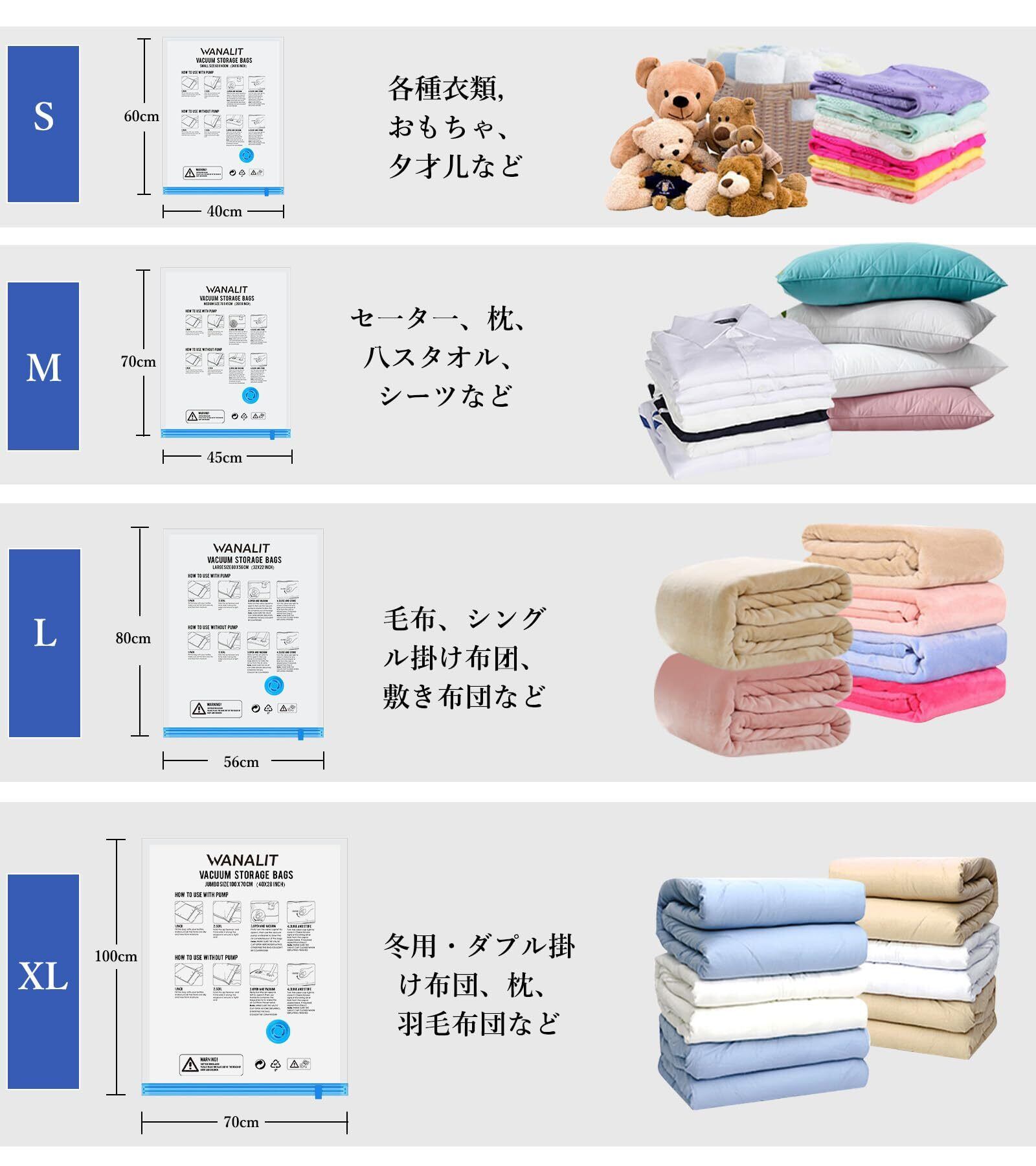 【3サイズ圧縮袋セットで多用途収納】 XL×3枚(100×70cm)、L×3枚(80×56cm)、M×3枚(70×45cm)の9枚セット。布団、衣類、ダウンジャケット、コート、枕、シーツ、タオルなど、旅行や日常の収納に最適です。コンパクトに圧縮でき、スペースを大幅に節約します。