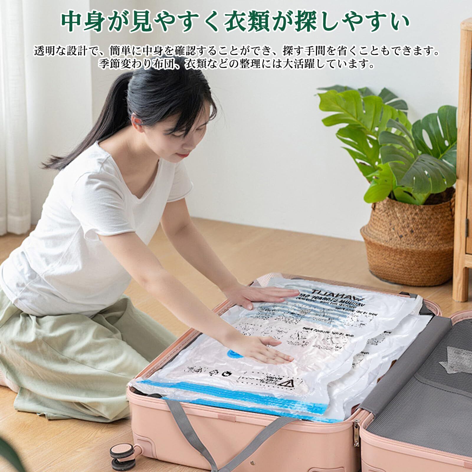 【容量80%削減でスペース効率化】 厚手で耐久性のあるポリエステル素材を使用した圧縮袋。布団や衣類を圧縮することで、クローゼットや寝室のスペースを最大80%削減。旅行時にはスーツケースの収納効率を向上させ、荷物をスマートに整理できます。繰り返し使用可能で、長期間の保管にも最適です。