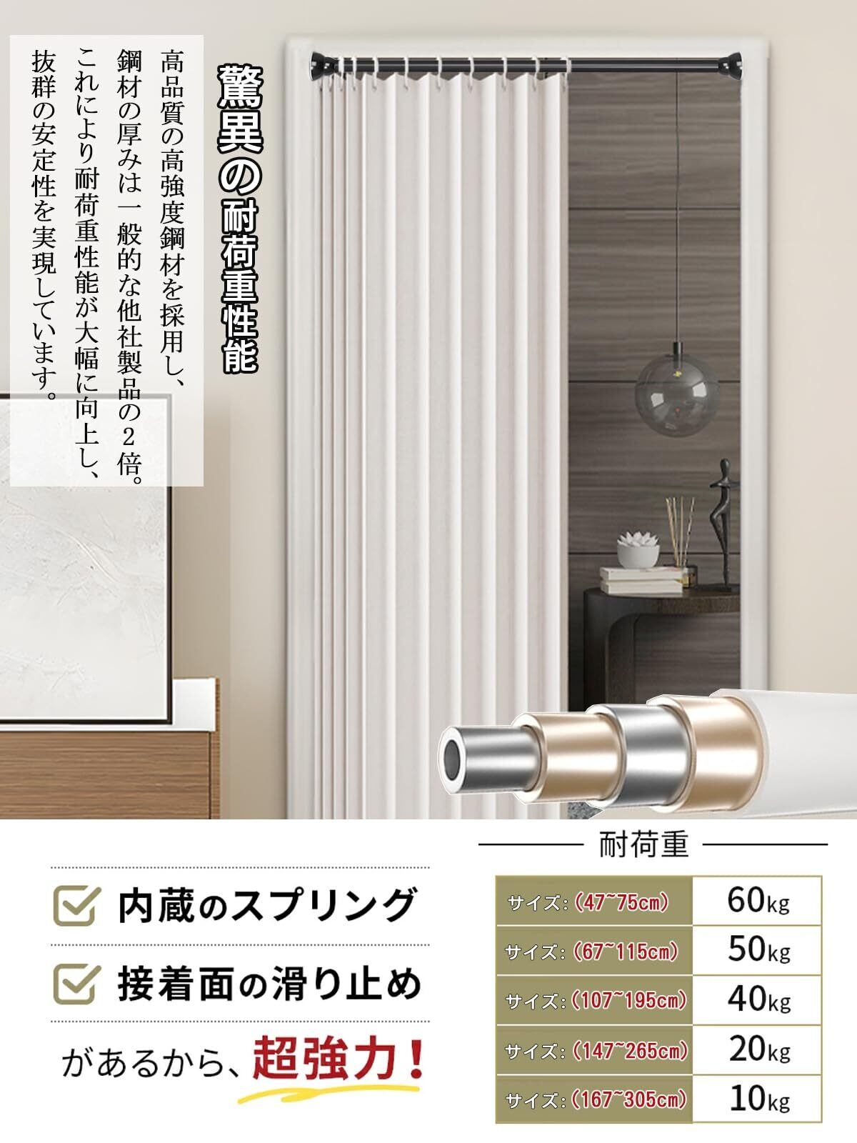 ツッパリ棒 超強力ステンレス製 突っ張り棒 カーテンロッド 穴あけ不要 窓用つっぱり棒 : 幅50~305cm 耐震頑丈設計 耐荷重40-50KG 幅広調整可能 複数サイズ対応 お風呂・浴室・窓枠・室内 シャワーカーテン・布団干し・クローゼット・コート掛け伸縮棒 フレキシブルインテリア用 (ブラック, 47cm~75cm)