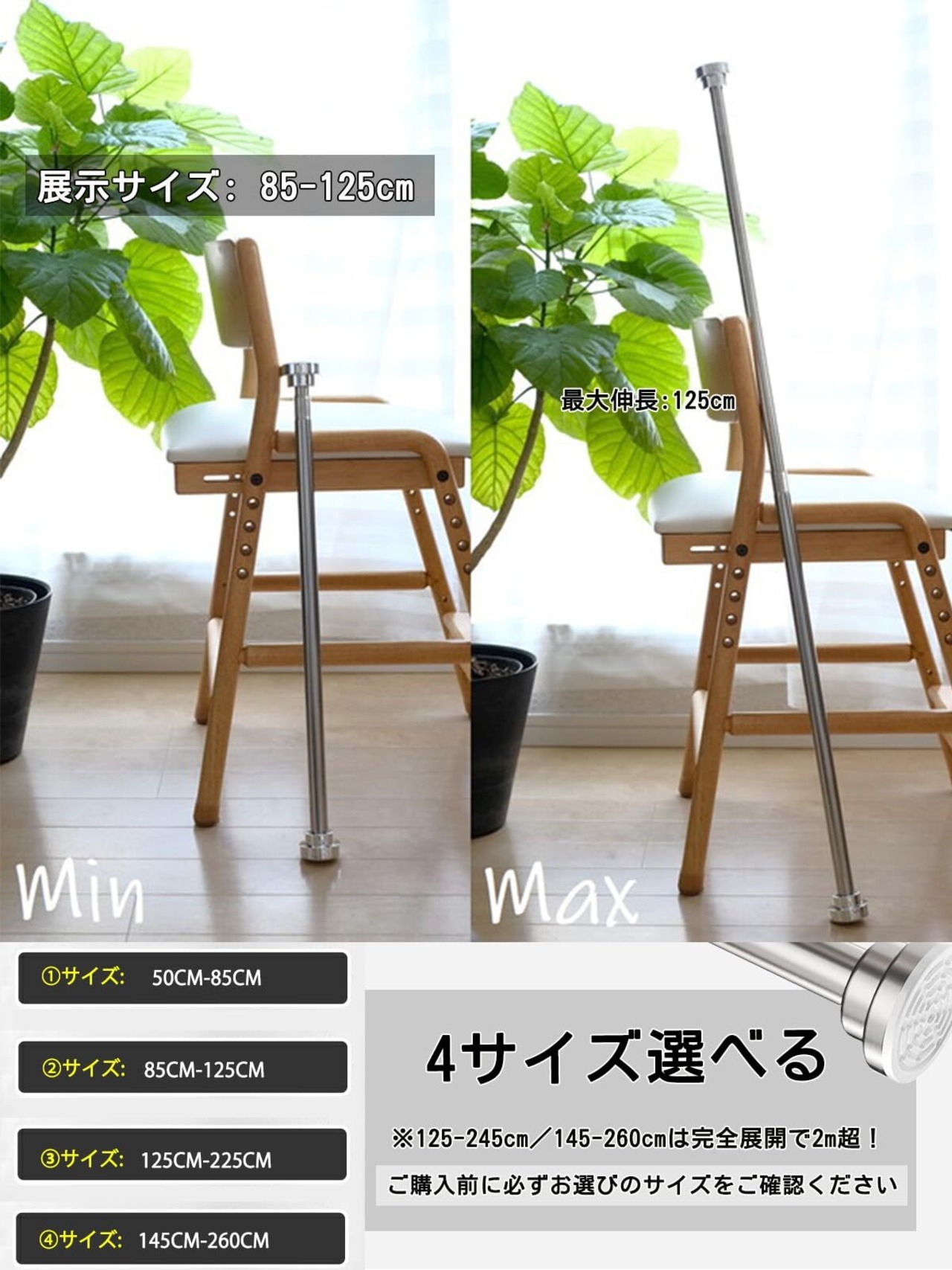サイズ(125~245cm):取付範囲125cm~245cm、耐荷重25kg。
