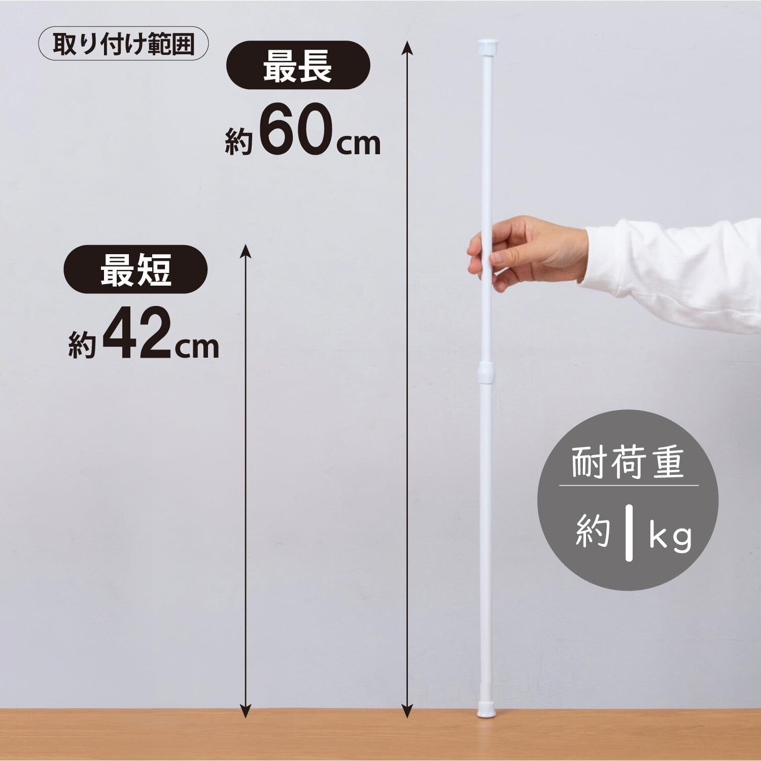 【商品仕様】:カラー/ホワイト、取り付け範囲/約42~60cm、耐荷重/1kg(取り付け時の長さや壁面の強度などにより異なる。)、内容/1本、本体サイズ/約直径1.3(先端部約直径2)×長さ40~70cm、材質/スチール・PP