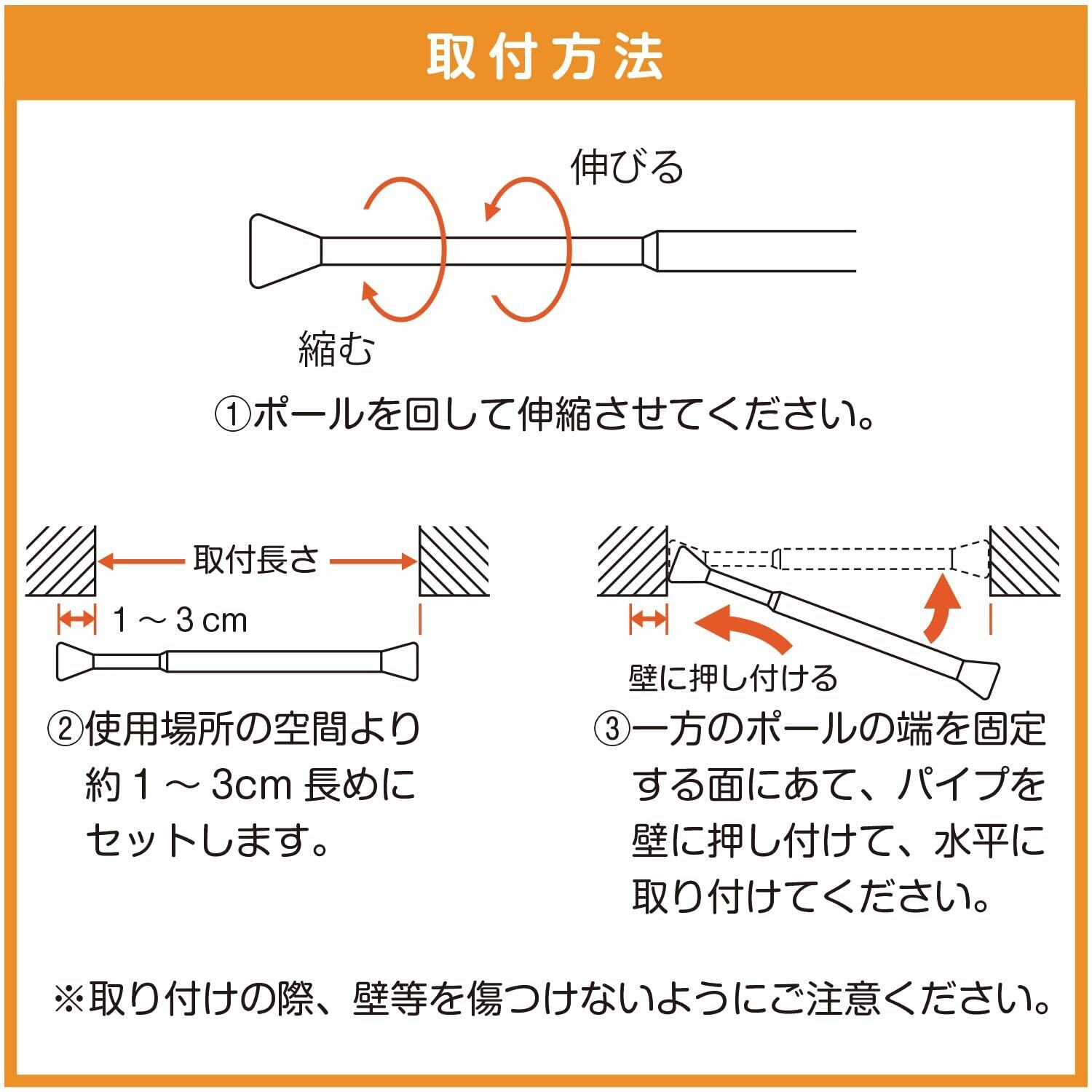 【ご購入前にご確認ください】:つっぱり棒は製品により長さが多少異なります。ご購入前に取り付けたい場所の幅を測り、つっぱり棒の最短の長さより幅のある場所でご使用ください。この製品は耐震を目的とした商品ではありません。