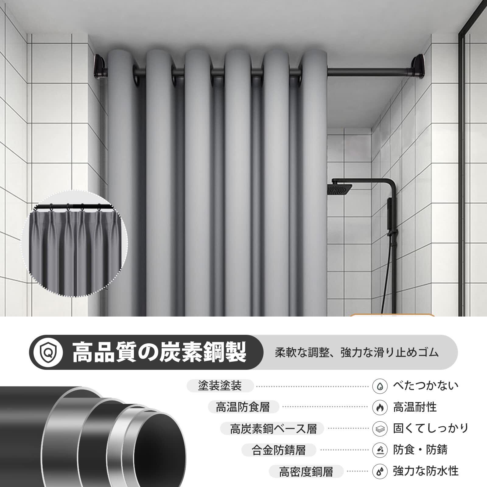 【高品質素材 強力耐荷重】本社の突っ張り棒は、304ステンレスを採用した伸縮ロッドとABS樹脂を加工した圧着板を備えています。つっぱり棒 強い負荷に耐えられます。耐荷重が約15~35kgです。 突っ張り棒はサビに強い炭素鋼製のパイプを採用します。壁に接するキャップはABS材質を採用するので、湿気の多い浴室でもカビの発生を抑制します。
