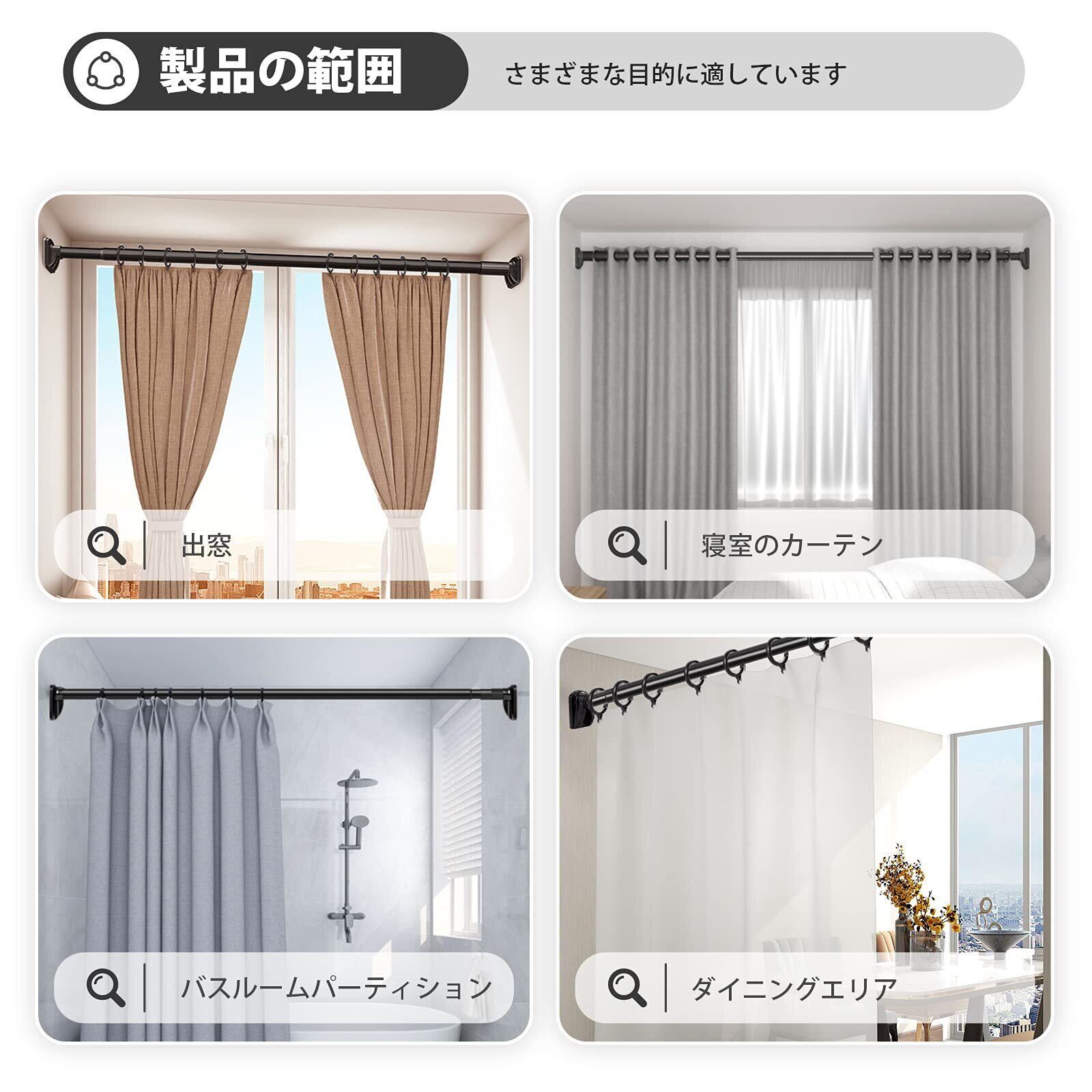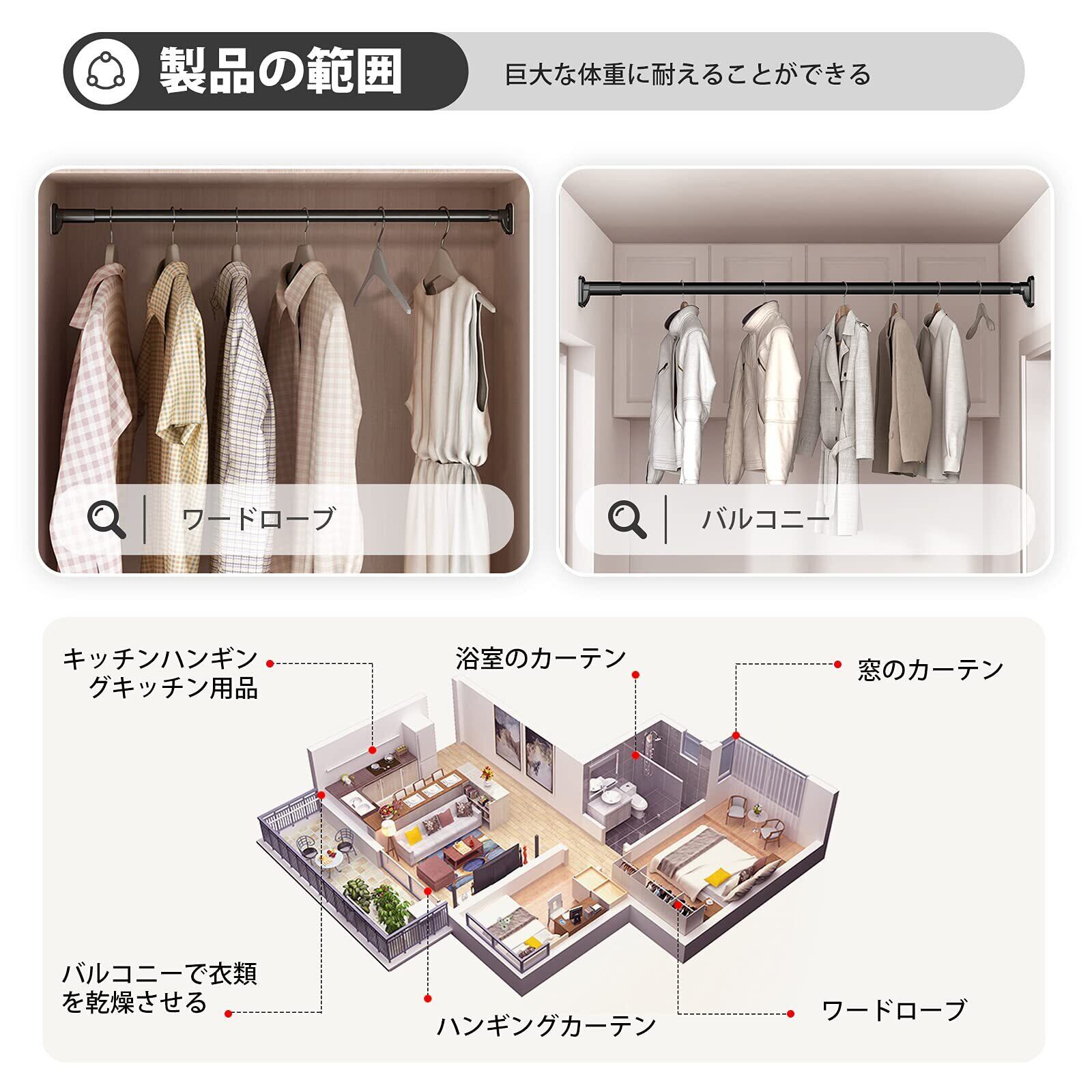 【多場所対応】 つっぱり棒は自由に長さが調節でき、どこにでも設置でき、狭いスペースはもちろん、家の中のデッドスペースにも使えます。 例えば:洗濯物を室内で干す、廊下でも部屋干し、ベランダの外に干す、つっぱり棒、クローゼットロッド、浴室用タオル掛け、室内用カーテンロッド、シャワーカーテンロッド、布団干し、(ご注意:商品を出荷するときに、両端のキャップは取り外し可能。改めて取り付けてもよろしいです。)