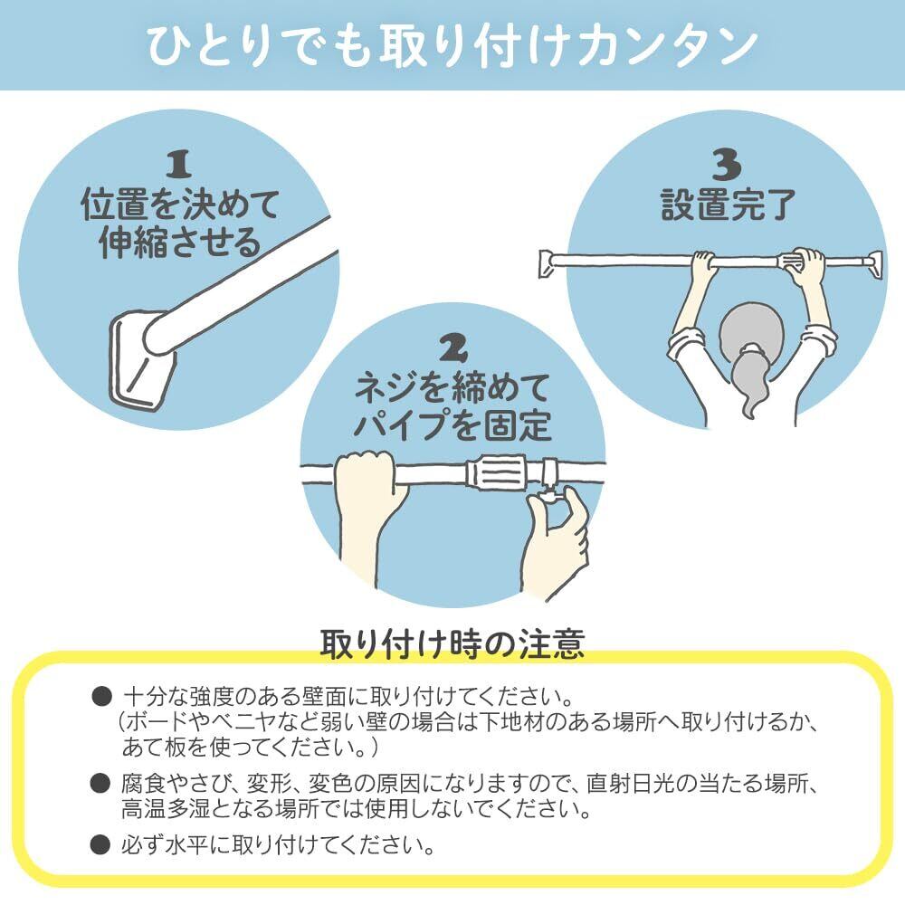 【ひとりでも取り付けカンタン】伸縮棒を支えてくれるアダプター付き。ひとりでも取り付けラクラク。1.アダプターを設置して伸縮させる。(伸縮しない側の圧着板アダプターに乗せる。)2.ネジを締めてパイプを固定。3.設置完了!(※壁紙に両面テープが残っている場合は、水で濡らすと簡単に剥がれます。)