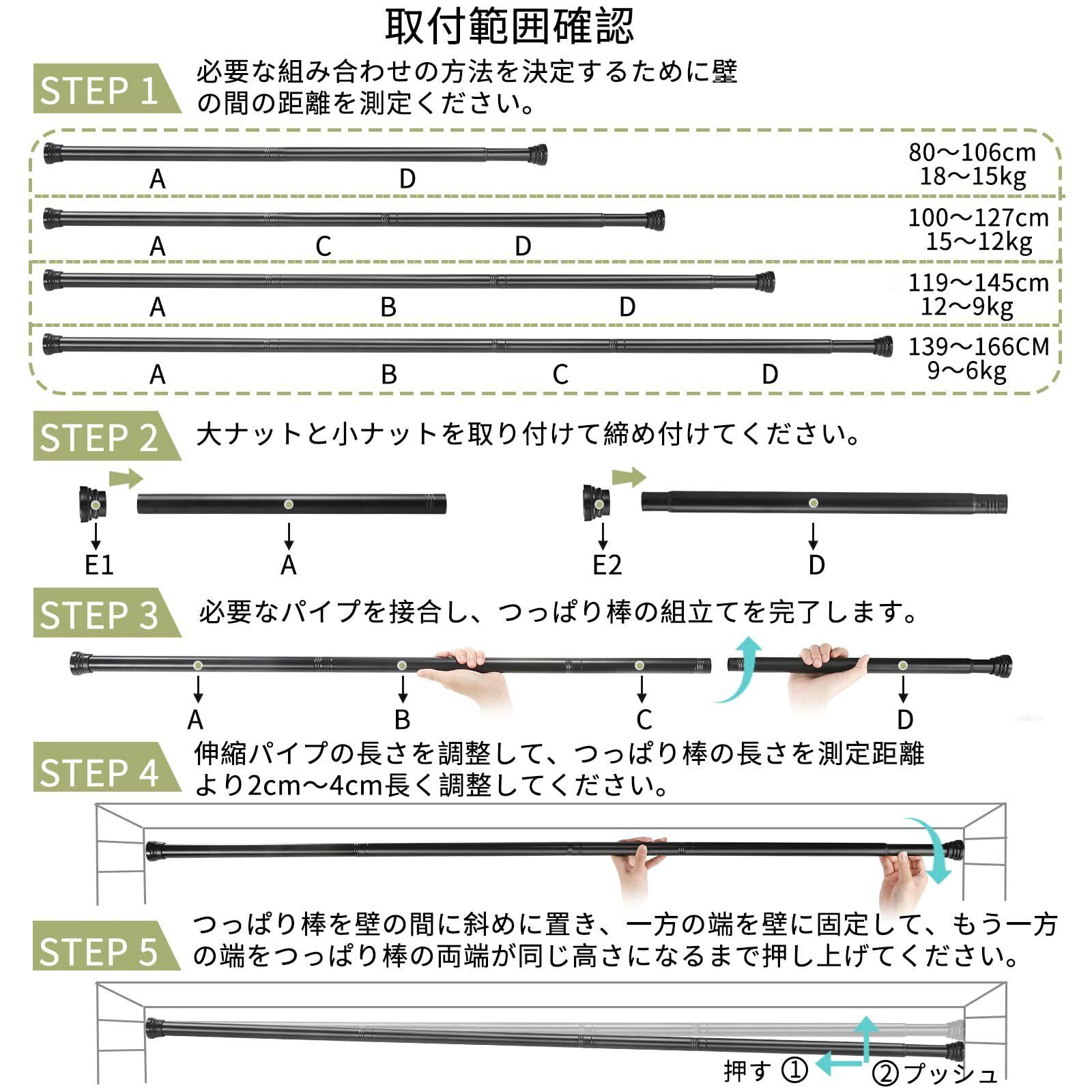 80cm~166cmの両壁距離を対応でき、つぎ合せ式のつっぱり棒は対応できる距離が長いだけなく、運賃を減らすので、さらにお得になります。