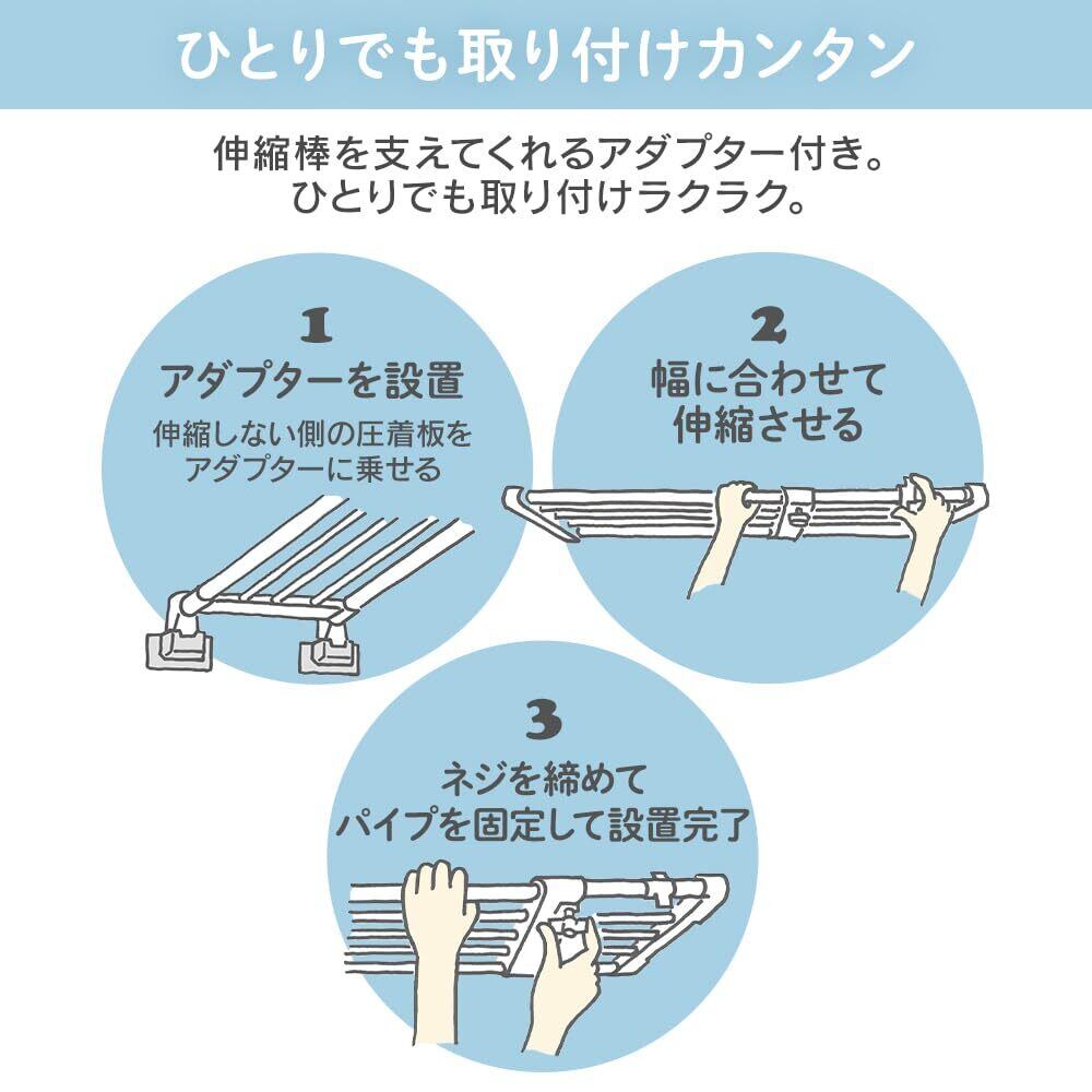 【ひとりでも取り付けカンタン】伸縮棒を支えてくれるアダプター付き。ひとりでも取り付けラクラク。1.アダプターを設置して伸縮させる。(伸縮しない側の圧着板アダプターに乗せる。)2.ネジを締めてパイプを固定。3.設置完了!(※壁紙に両面テープが残っている場合は、水で濡らすと簡単に剥がれます。)