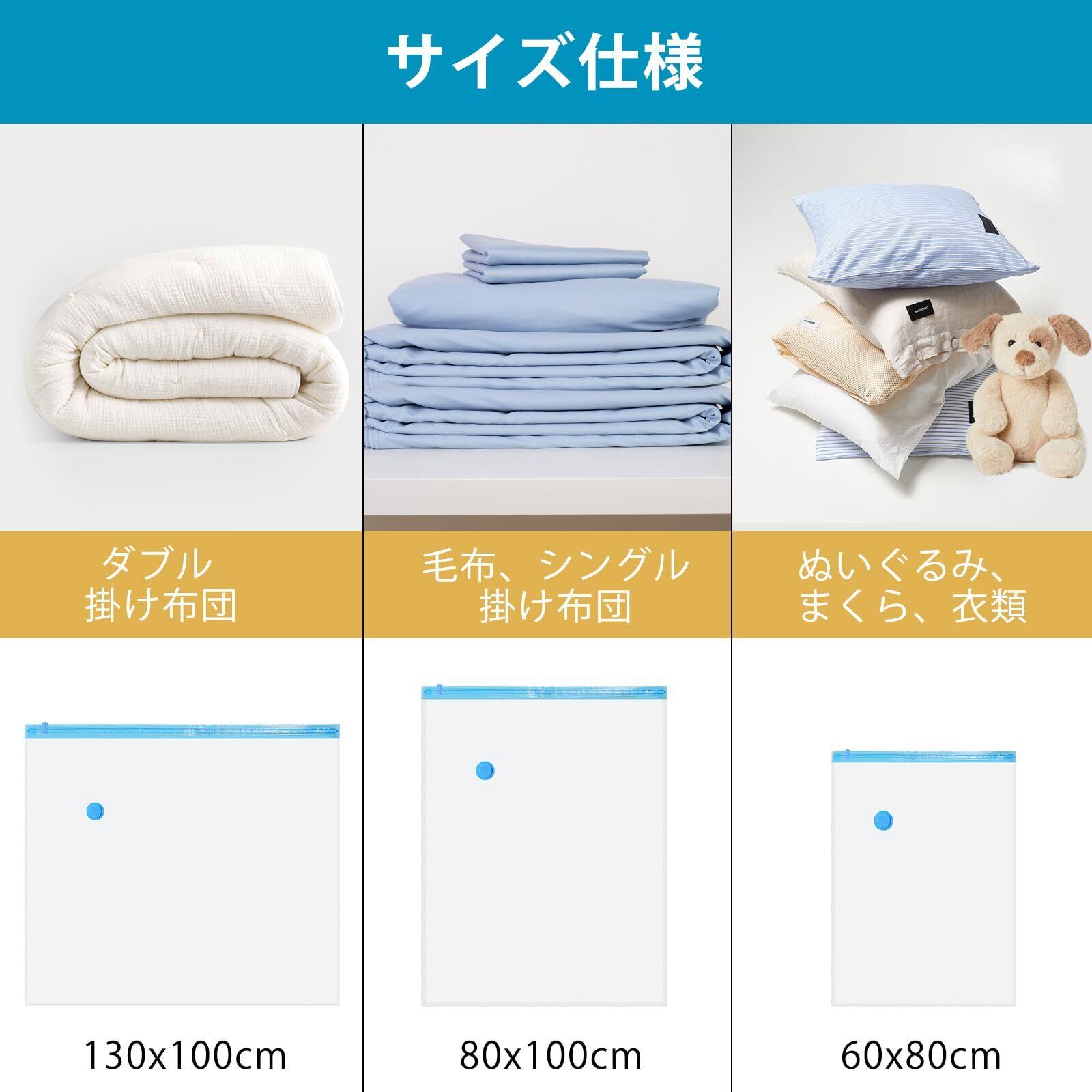 収納スペースを有効に活用:サイズ:100*130cm六枚入り。収納の目安:シングルサイズ掛ふとん*1、座布団*4、毛布・タオルケット*4(圧縮袋1枚あたり)。布団をたくさんまとめて収納して、空いたスペースは他の物を入れたり、空間を有効に活用できます。最大75%のスペースを節約できます。