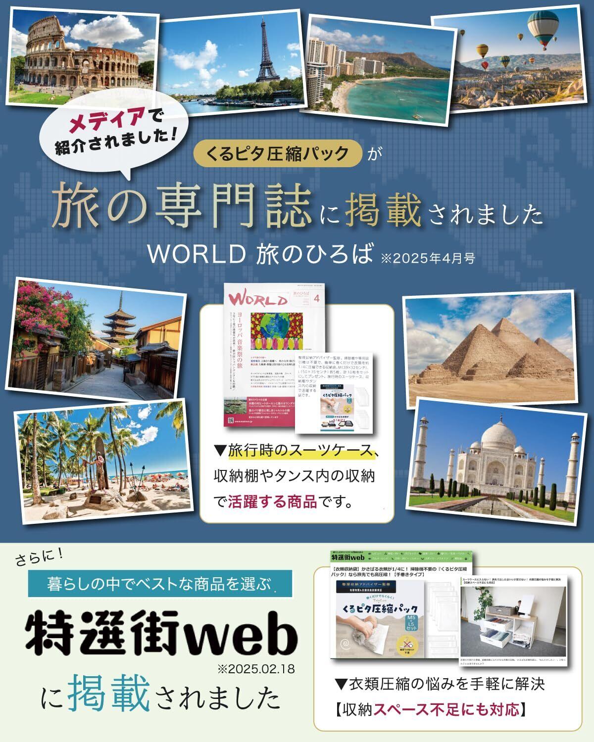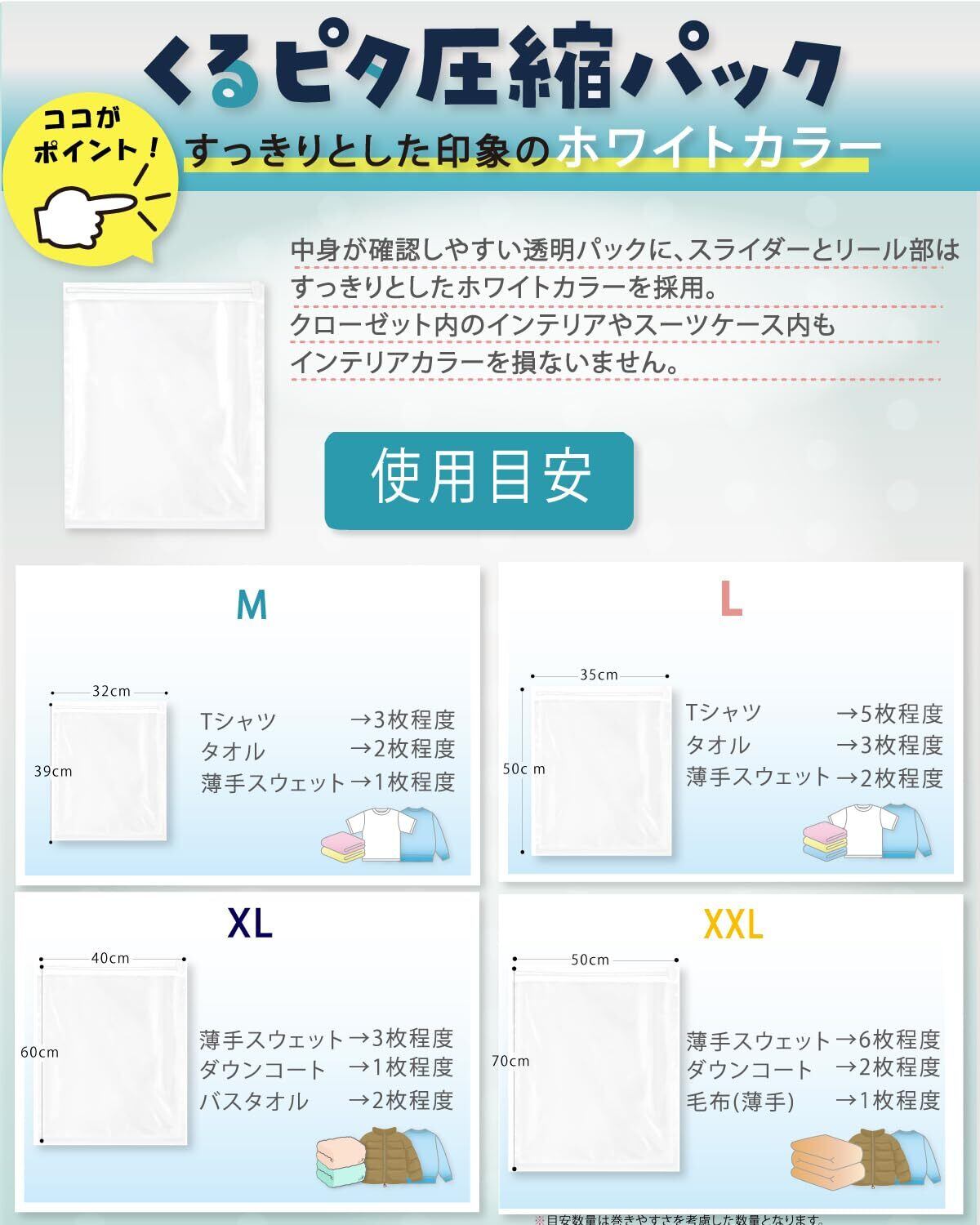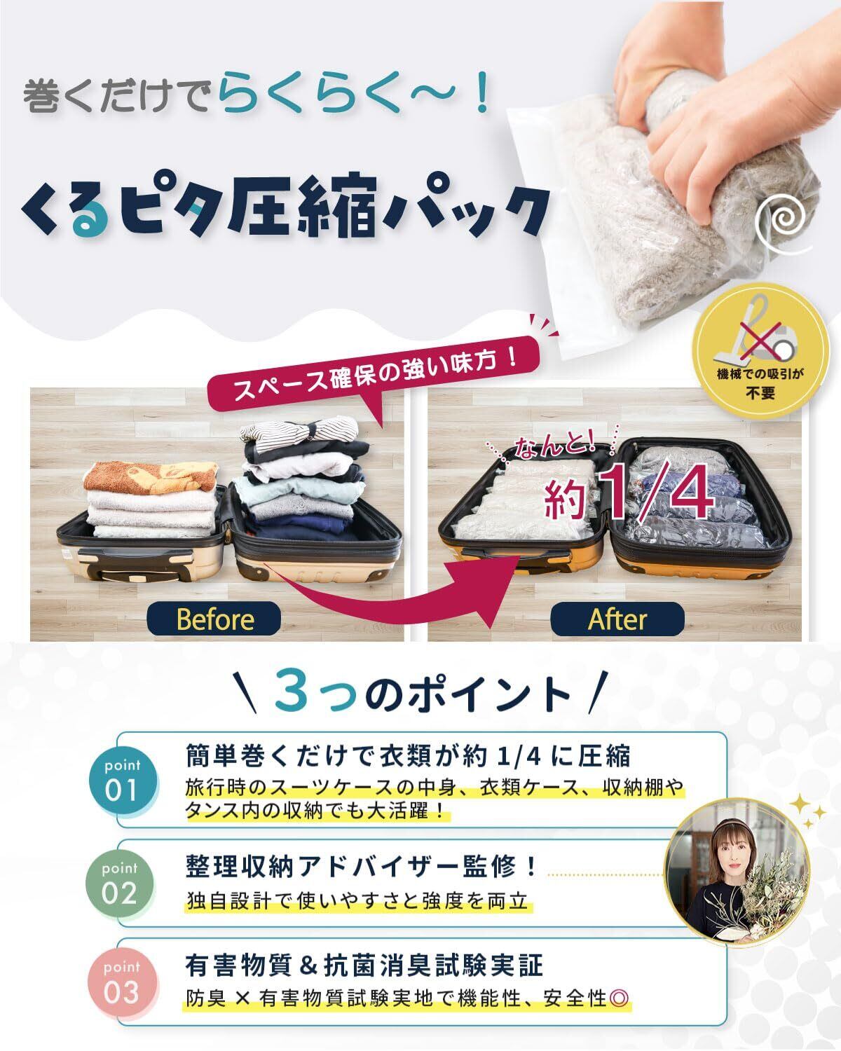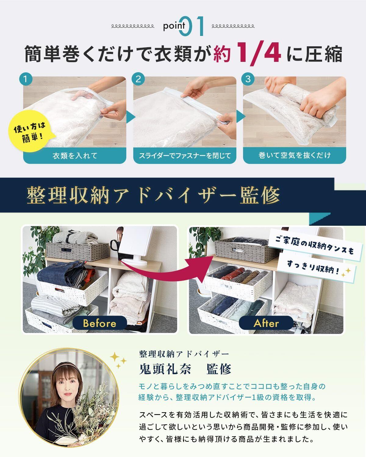簡単まくだけで衣類が約1/4に圧縮! 旅行時のスーツケースの中身、衣類ケース、収納棚やタンス内の収納で大活躍!