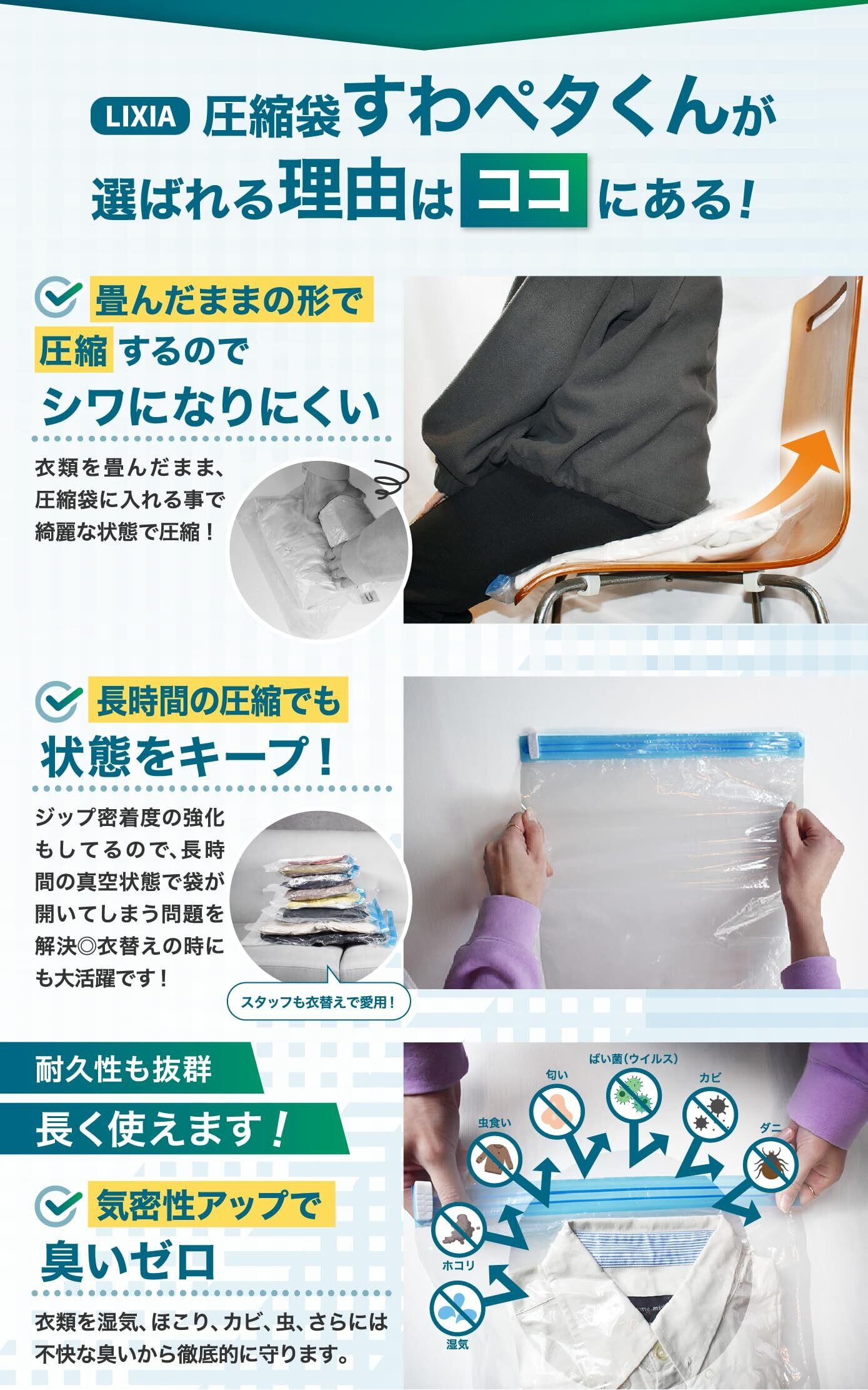 【 上から座るだけ。わずか5秒で圧縮 】 LIXIAのすわペタくんは独自開発の構造により嵩張る衣類をわずか5秒ほどで力を使わず、上から座るだけで荷物の量が約1/2〜1/4ほどのサイズに変身!是非LIXIAの圧縮袋で荷物に囚われない旅行をお楽しみください!